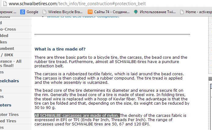 ты читаешь то что тебе интересно и выгодно. Но все же прочти официальную инфу Шлвальбы, и ответь на прочтой вопрос - что ты подразумевал, указывая на наличие кевлара в твоей швальбе? Это как то повлияло на порез? Я уже не говорю, что прокол в 10мм, это дыра. И независимо от кевлара, карбона, покрышки, Путина, никакой герметик, или еще чего, не удержит воздух в покрыхе. А если это царапина протектора в 10мм, то у меня и на камерке таких вагон. и ничего, катаю.
