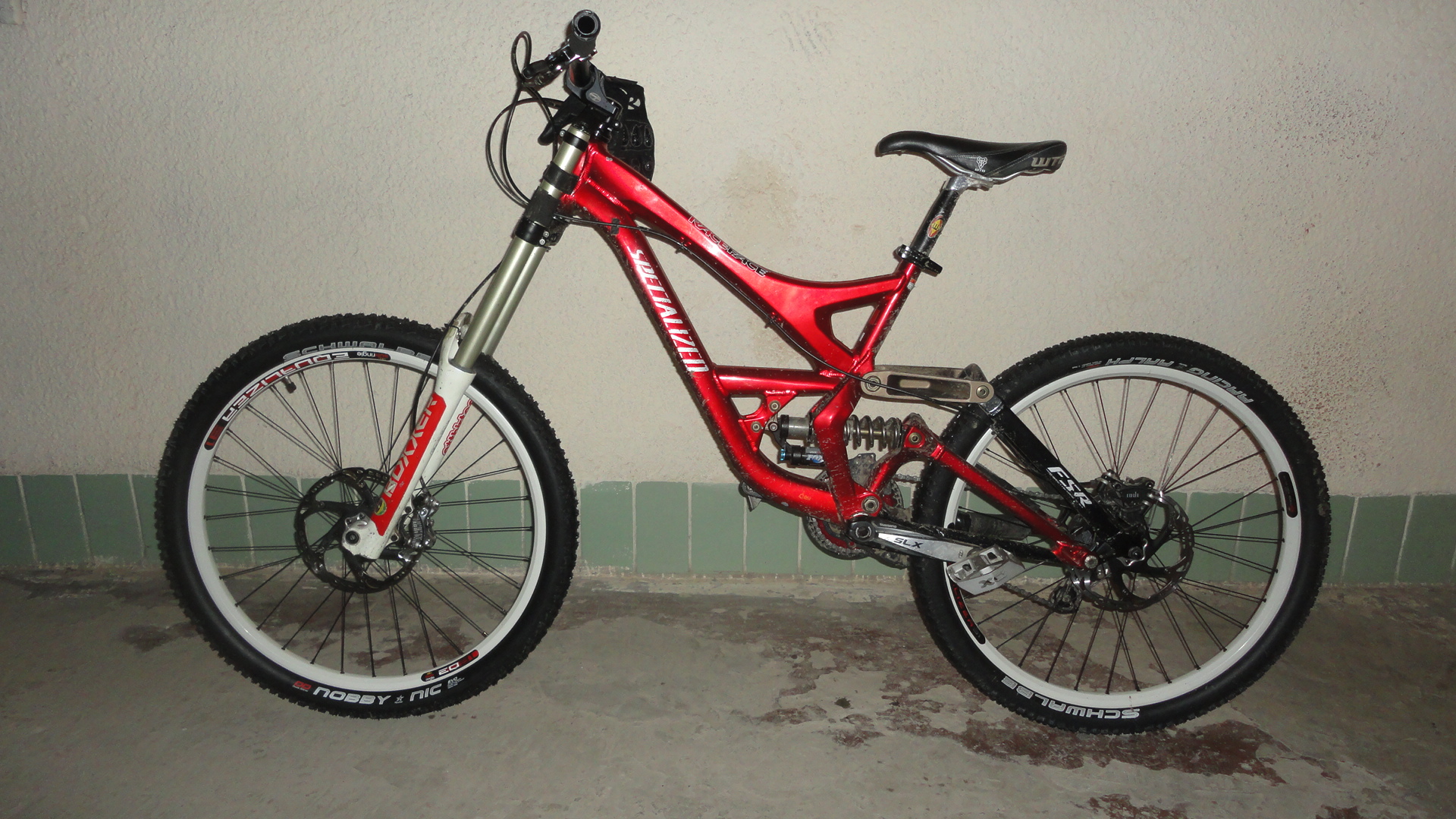 Потихоньку привел аппарат к финальному виду (ну почти :)). Всему виной boxxer, который выглядел белым пятном на общем черно-красном фоне байка. Потому белые штанишки вилки пришлось "подпереть" белыми деталями. В результате вилсет пересобран на белых ободах SunRingle EQ31. Задняя втулочка сменилась на SunRingle Jumping Flea (не смог удержаться от почти 50% скидки в велопробеге), пришлось правда использовать ось-переходник с 12 на 10мм. На выходе имеем универсальные колеса - прочные и достаточно легкие, позволяющие не обламываться как в горах так и в городе. Использование втулки с алюминиевым барабаном подразумевает наличие кассеты на пауке. Шимано XT наш выбор. Гнутые тормозные диски? Не, не слышал :) Использование роторов шимано RT76 позволило забыть об этой проблеме. Коды с этими роторами тормозят получше, но модуляции поменьше стало. Шаг в сторону гейлайта - покрышки schwalbe nobby nic спереди и racing ralph сзади. Обе с double defence. Это чисто городской вариант, ибо катать на даунхильной резине не в горах удовольствие сомнительное. Хотя стоит отметить, что даже 2.5 хайроллеры по асфальту едут лучше, чем может показаться. В горы на кевларе я не ездок, потому тяжелая резина лежит и ждет своего часа. Ах да, камеры все же толстенькие стоят - даунхильная швальба. Это не полукилограммовый максис, но даже на низком давлении не пробивались. Стыдно это признавать, но большинство времени байк используется в городе для езды за пивом, потому пришлось учесть этот факт при выборе параметров трансмиссии. В результате остановился на передней звезде 34Т и кассете 11-32Т. Такое соотношение позволяет избежать использования "кривых" передач в городе и не убивать коленки, а в горах я ссыкую быстро ездить :)