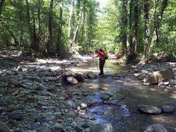 Утром выдвинулись на поиски тропы к г. Букепка. Хотя, тропа понятие условное, она петляла и исчезала в кушерях, фактически издеваясь, два раза оборвалась на самом хребте перед поворотом на Бешенку. На г.Букепка нашли треангуляр и по пути встретили, размеченные надписям прошлых “экспедиций” деревья. Силы и вода кончались, общий набор высоты был уже около 1000 м, а время к обеду. Решили возвращаться обратно… Оксана очень соскучилась по людям в форме МЧС и уговаривала нас заблудиться, а навигатор кричал-вниз, товарищи, к реке..вперед. За пару часов спустились к реке и пробирались через заваленное ветками русло около часа. Разведали еще одно ответвление от русла реки. Выйдя к первой развилке к 14.00, искупались в купелях, набравшись сил, потопали вниз по течению, постоянно форсируя речку по камешкам. Ноги были мокрые, но тренированные:)