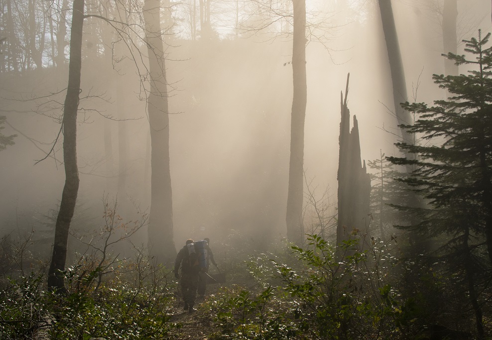 Облачность довольно частое явление в этих местах, дымка настолько густая, что посмотрев вперед едва ли можно разглядеть что то перед собой в нескольких метрах. В такой момент очень легко сбиться с пути, несмотря на то, что идешь по гребню. Но если вдруг случится так, что облака вдруг уйдут в стороны и на мгновенье образуют маленькое окно, словно приоткрывая завесу тайны гор, то потрясающего воображение вида не избежать.