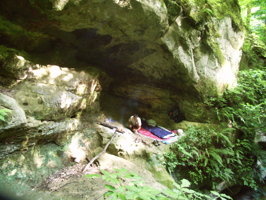 Доставши компас, я понял что Круглая - это вон та гора без отчетливой вершины, а Семашхо вообще аж вооон та вот. Подумал, как это люди тут переходят, такой охрененный спуск и подъем, где вообще местами "стены". Короче приспустился я, постоял так минут десять, подумал.. и залез назад на стоянку к Индюку. Та ну его нафих, до темна часа три, не полезу, и вообще я на утренней домой собирался! В общем, решил я заночевать тут. Залез на ближнюю-нижнюю скалу, пофоткал Индюшку. Кстати, я думал, как же фоткаться в одиночном походе. Ответ лежал прямо под ногами! Волшебные желтые шнурки!