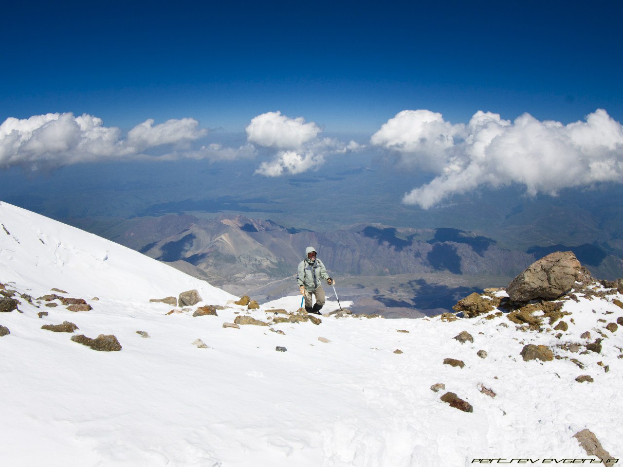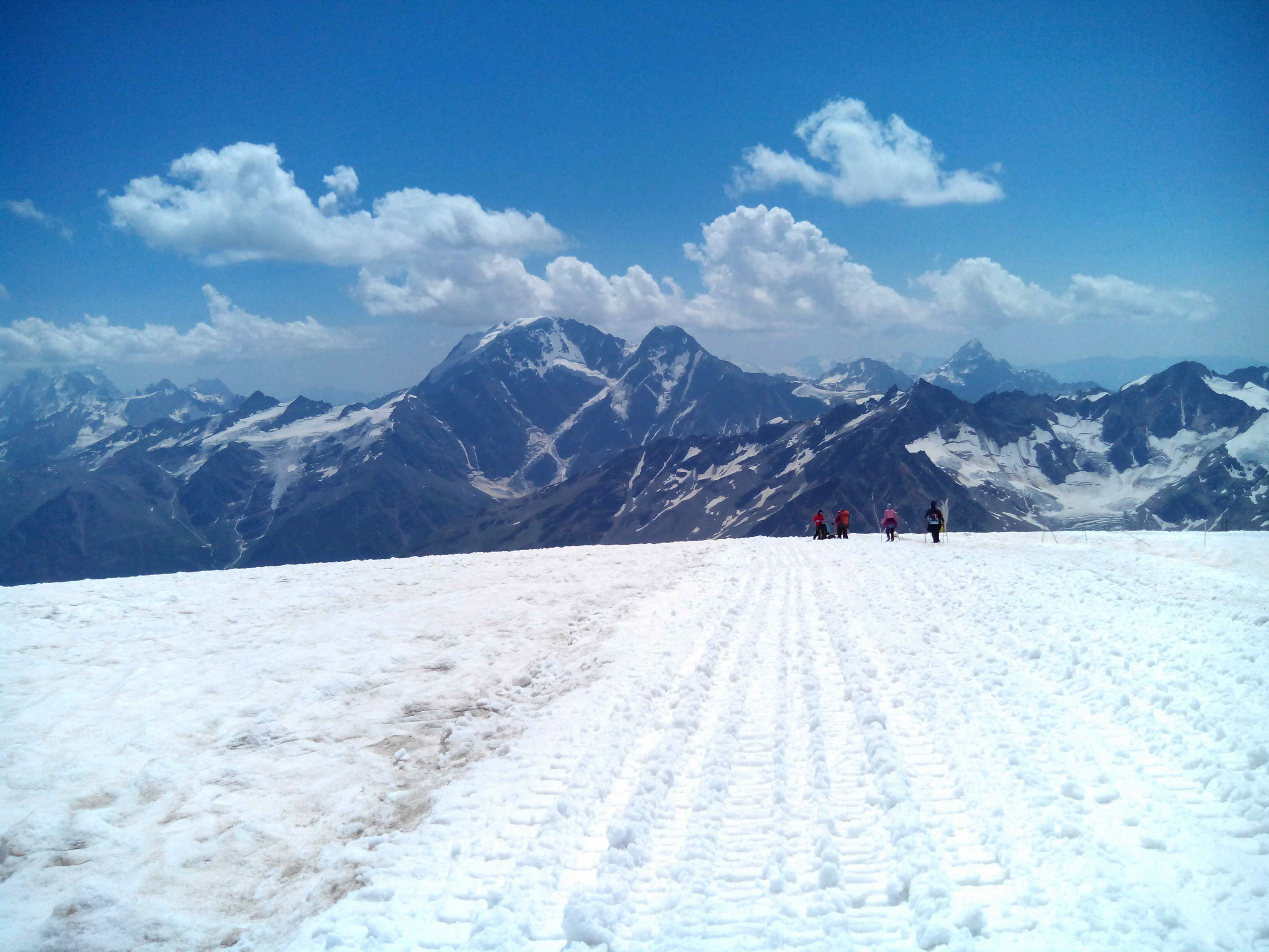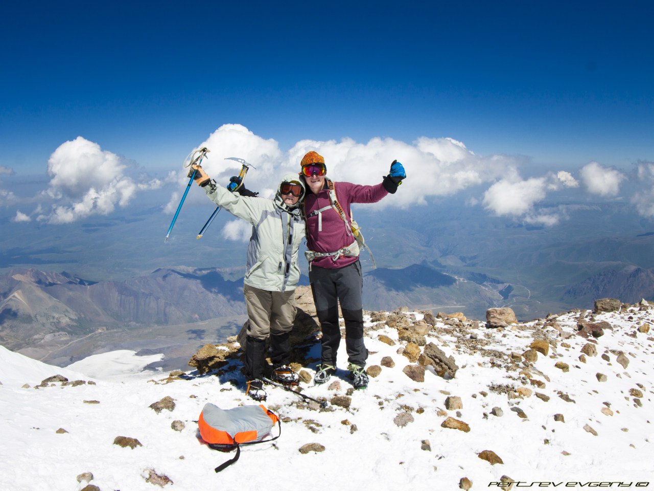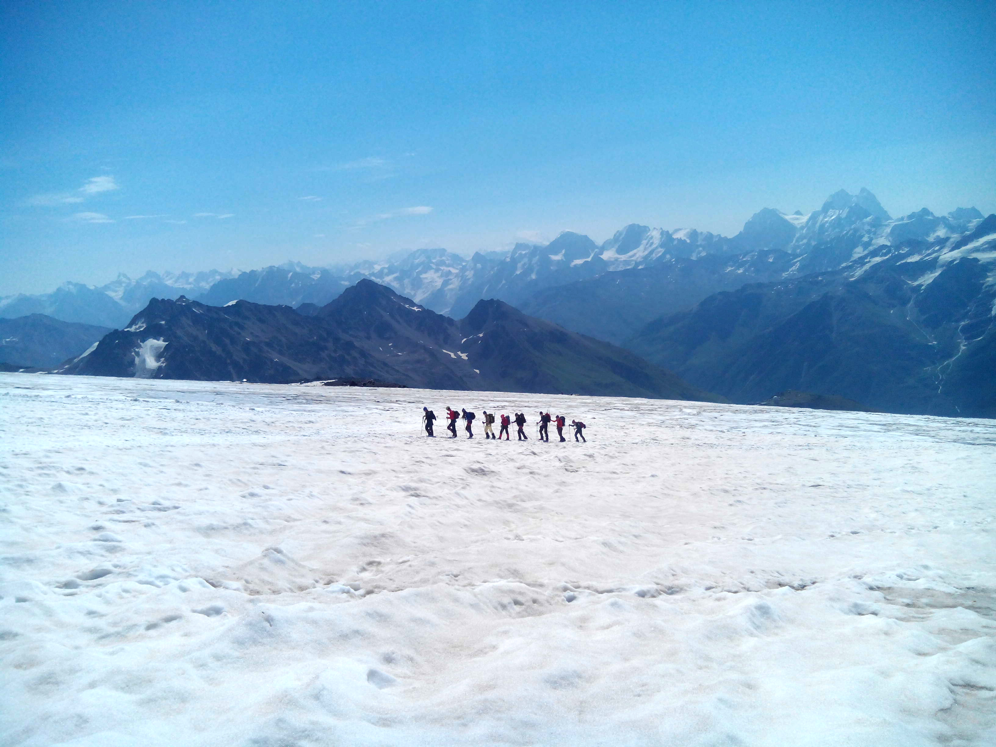 Обнимаю Женю, он счастлив. Мы сделали это. Мы наслаждаемся видами. Мы здоровы и хорошо себя чувствуем. Фото, фото, фото... Наделали фото. Но оно никогда не передаст полной красоты. Это правда волшебно. На спуске просто летим. Кошки держат на чистом белом снегу. По дороге встречаем Алика и Алину, подбадриваем незнакомых людей, которые выглядят особенно измучанными. У меня в голове зреет план, как уговорить Женю идти на восточную вершину, а он говорит, что должен быть повод сюда вернуться. Но тут произошло нечто ))))