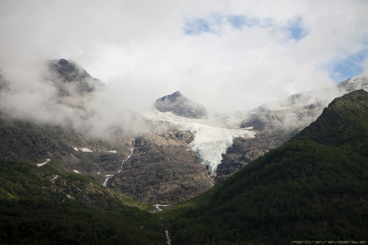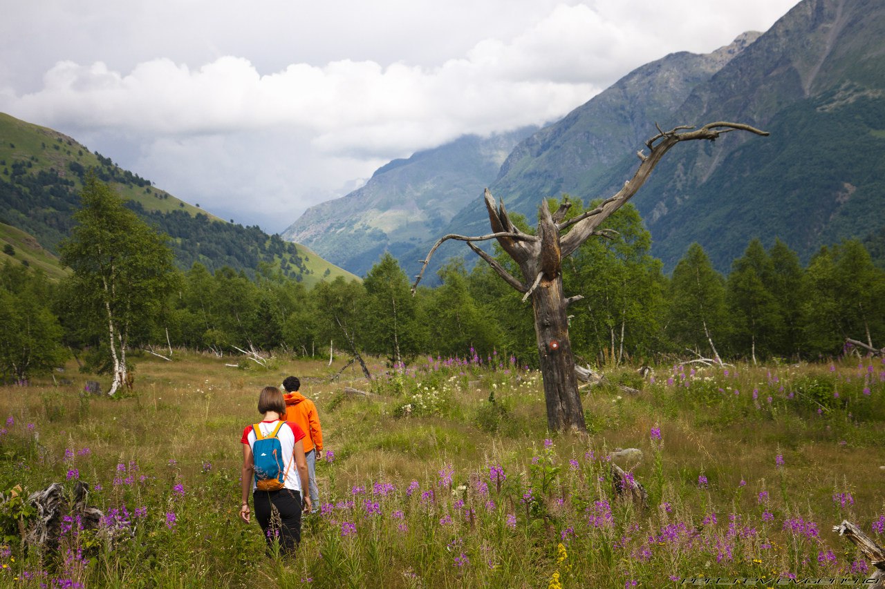 Боря летел впереди всех в ожидании глинтвенйа в кафе на станции Мир. А не вышло ))) Кафе тоже было закрыто. Но вторая вагонная канатка была открыта. На Кругозоре встретили Олиного товарища, который там работает, он угостил нас кофе, чаем и пивом. Оказывается, если банку кофе вскрыть на высоте, то можно устроить фейерверк. Совсем быстро мы спустились до Азау и начали искать гостиницу. Мест почти нигде не было, а гостиницу и баню в комплекте удалось найти только в Вершине. Честно говоря, номер не порадовал - 750 р c человека за комнатку с окном как в подвале, плюс не добивает ни вайфай, ни 3G. Зато вода горячая. ГОРЯЧАЯ. ВОДА. Кушали во фрирайде, достаточно компромиссные цены и порции для голодных лыжников. большие удобные столы для больших компаний. После обеда отправились на прогулку в сторону поляны Чегет. Туда с Азау ведет очень красивая тропа, вдоль реки, сплошь усеянная кустами ягод - черника, земляника, костяника... Можно было впринципе не обедать, жить на подножном корму. И везде рос иван-чай, Женя научил как правильно его собирать и я набрала полный рюкзак (надеюсь, у меня скоро будет вкусный чай)