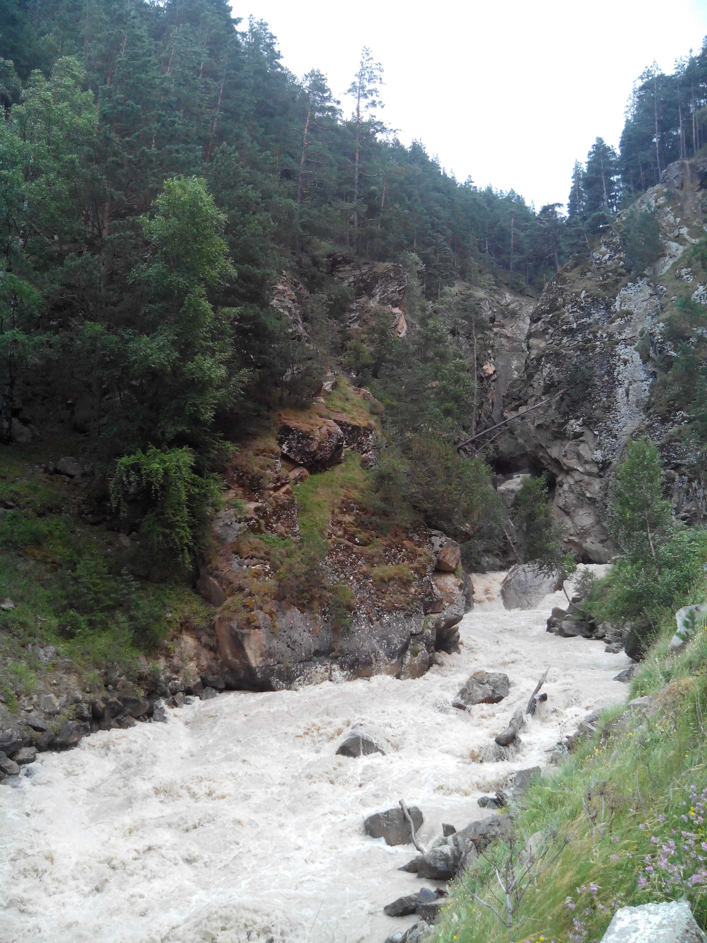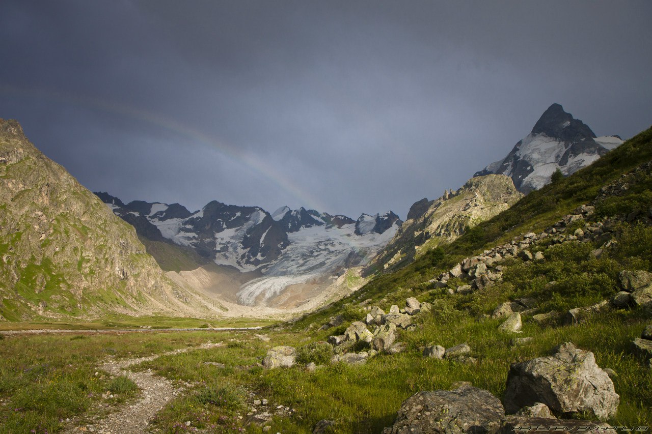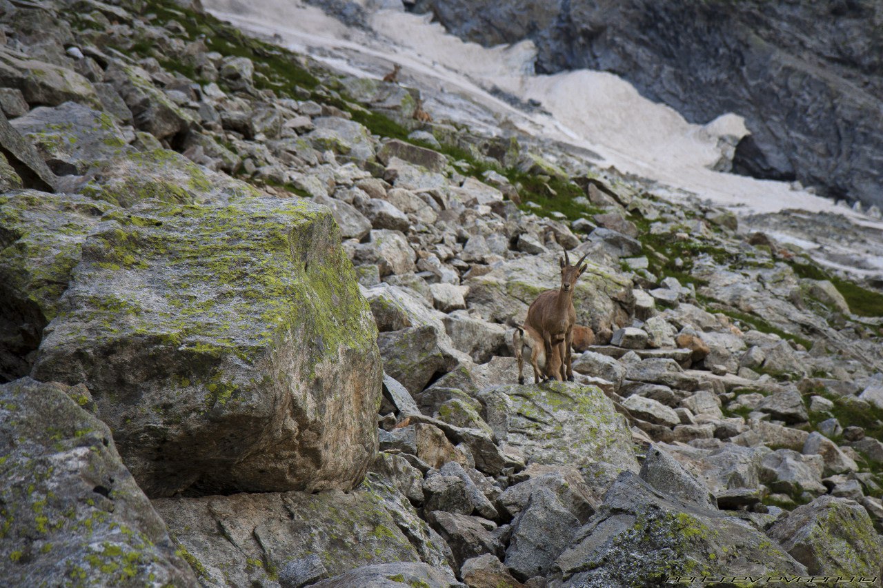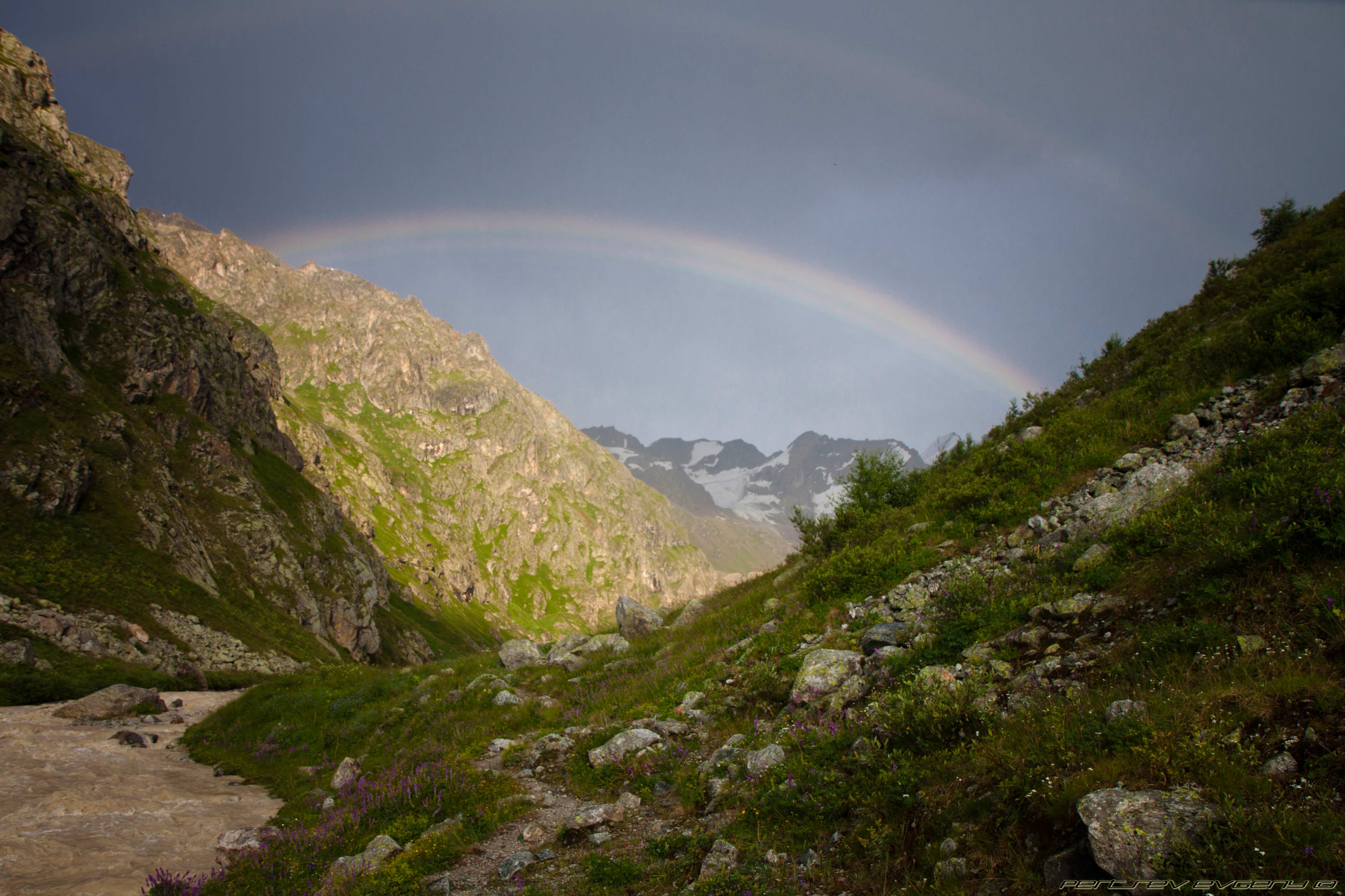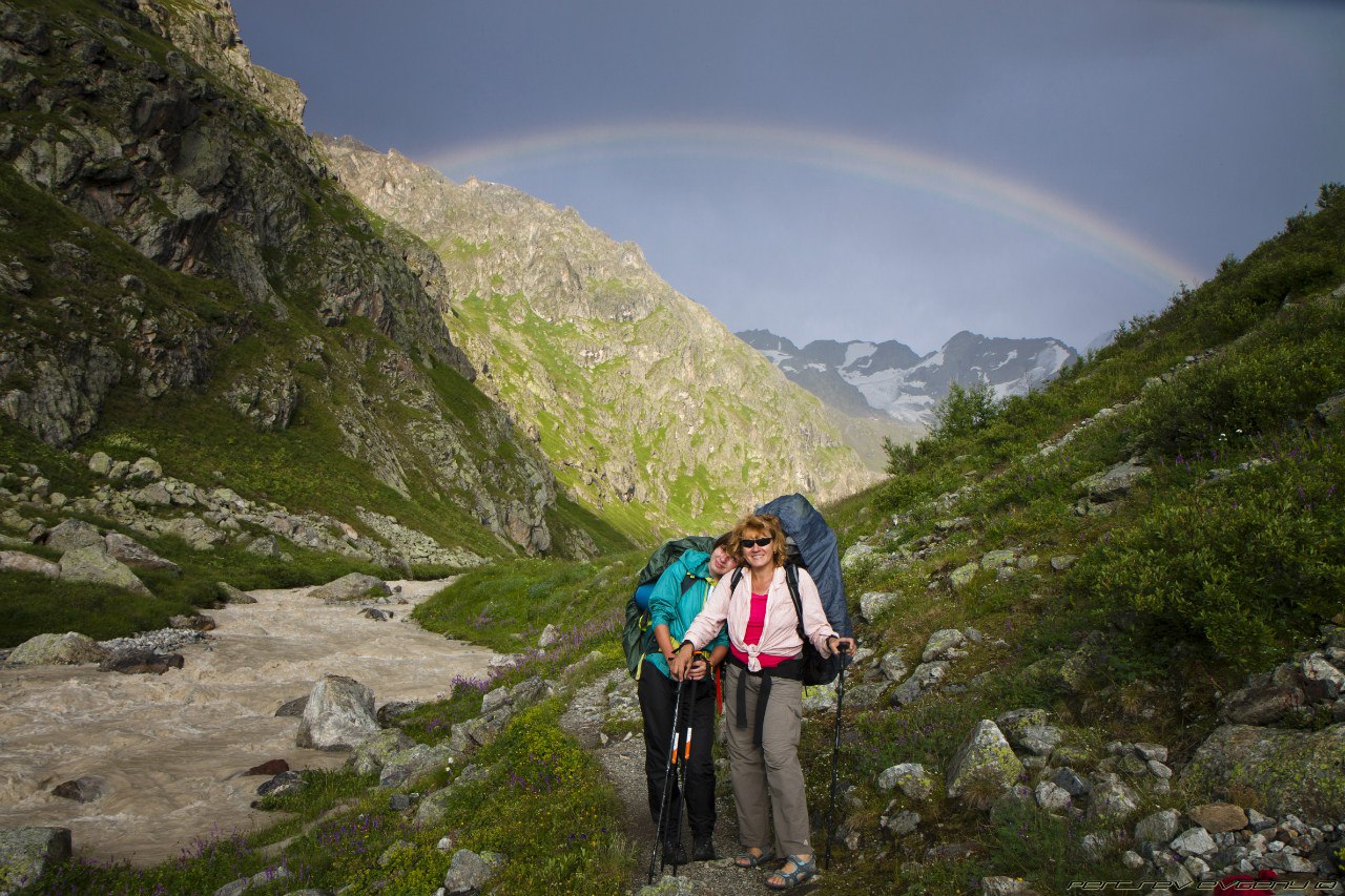 я шла следом, но после Алика тропа уже обсыпалась, а скала была из чего-то, что обламывалось, когда берешься за это пальцами. Пришлось поверить наслово, что виды оттуда красивые. В том районе бродило столько диких козочек, прямо, как говорится, "край непуганых идиотов". Мы разглядывали с любопытством их, а они нас. На обратной дороге нас настиг дождь, качественный, летний, прохладный и всепроникающий, не спасали никакие дождевики, в лагерь мы прибыли полностью мокрыми, и, улучив удобный момент, быстренько спаковали свои вещи и убрались оттуда вперед, к цивилизации. Когда мы шли обратно, на небе была потрясающая радуга, а между горами пробивался солнечный свет. Вода в реке была цвета кофе с молоком, бурное течение сопровождало нас всю дорогу.