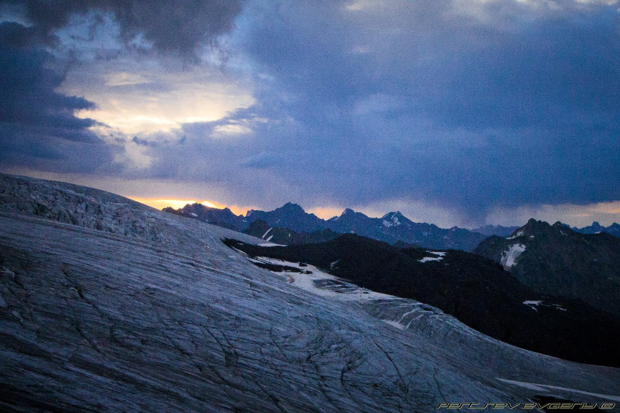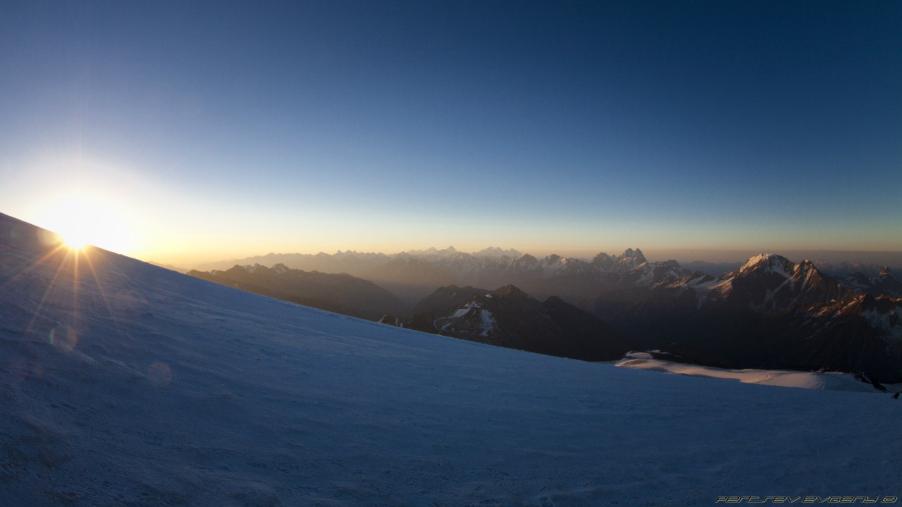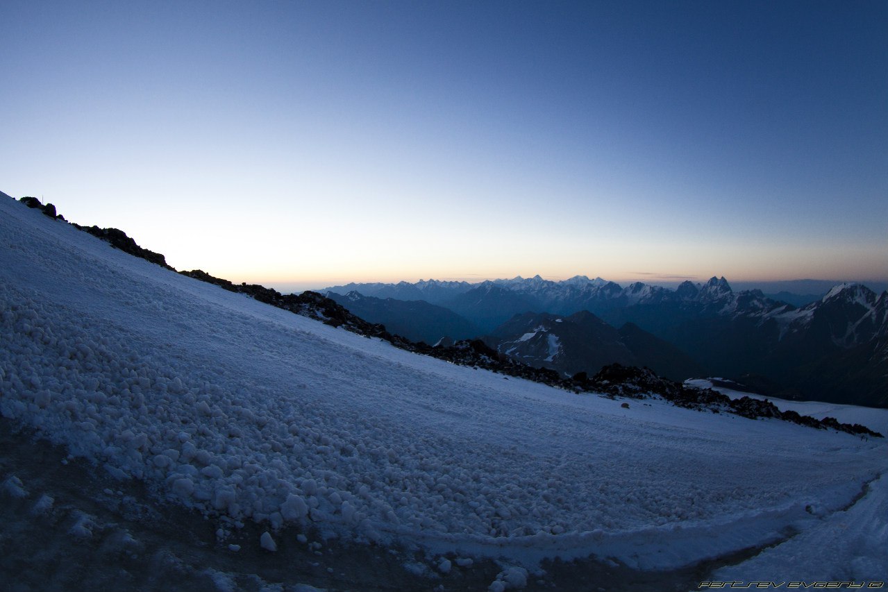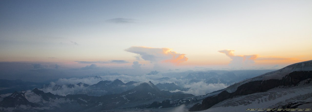 Это такая красота, десятки фонариков, летящих по Косой полке - гора с огоньками. Они манили и звали вперед. Мы шли и шли по темноте, и тут я почувствовала, как начинают мерзнуть пальцы на ногах. Мерзнуть, а потом болеть. Стиснув зубы, я ждала рассвета. И вот они - первые лучи солнца, розово-желтые отсветы, разноцветные тени гор, волшебный свет с обеих сторон. Мы остановились на Скалах Пастухова, там в первых лучах солнца грелся монохромный пушистый пес (вроде, он живет на Приюте). На косой полке солнце уже играло вовсю. Вершина была открыта, Горы вокруг были нагими и поражали величием. Эльбрус нас ждал, погода была идеальной. С такими видами холодный ветер казался не таким уж и страшным. В этот момент, стоя на Косой Полке, я знала, что мы поднимемся наверх. Да пусть на меня поругаются, я знала что мы зайдем на обе вершины.