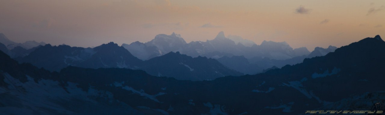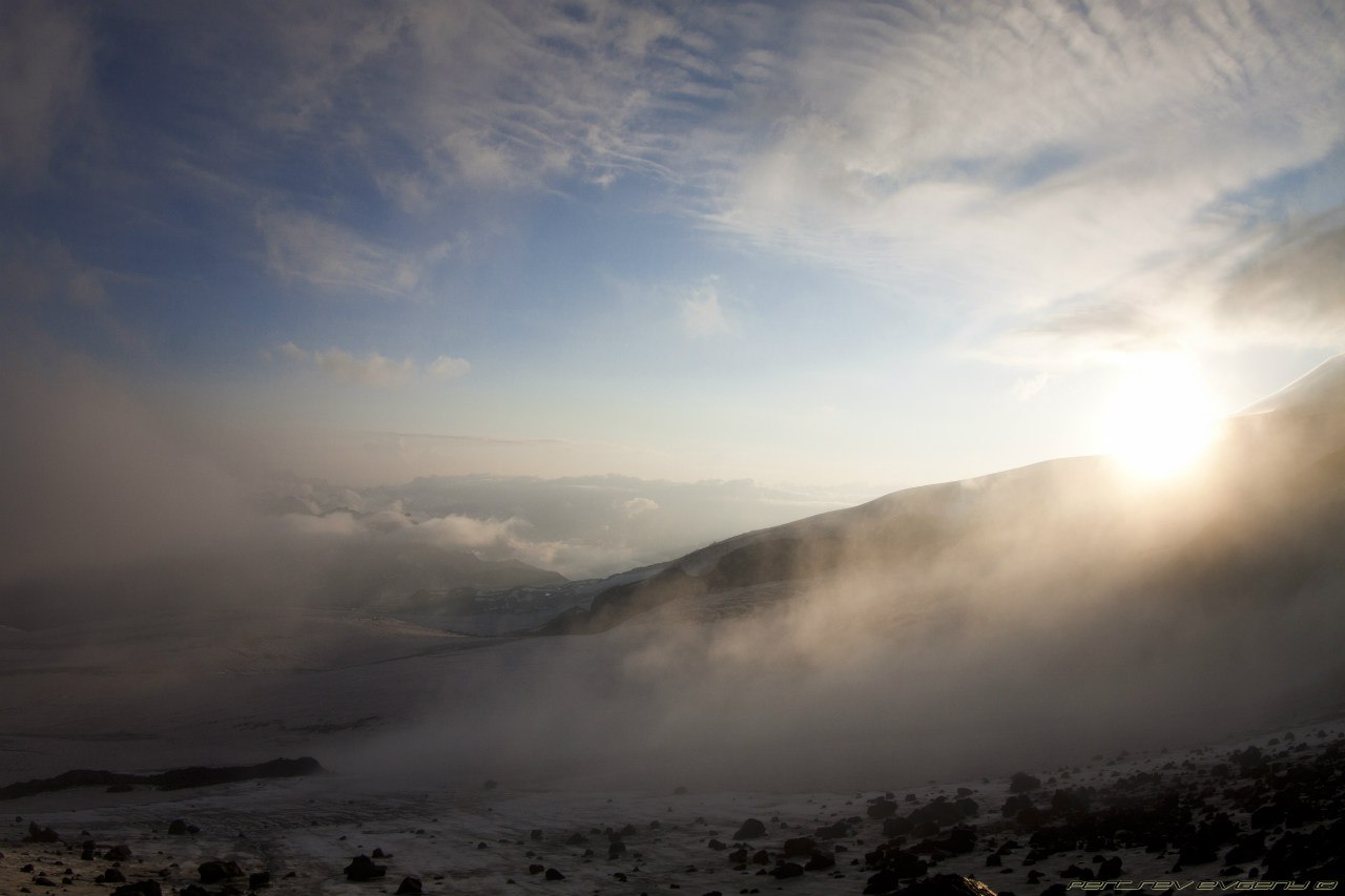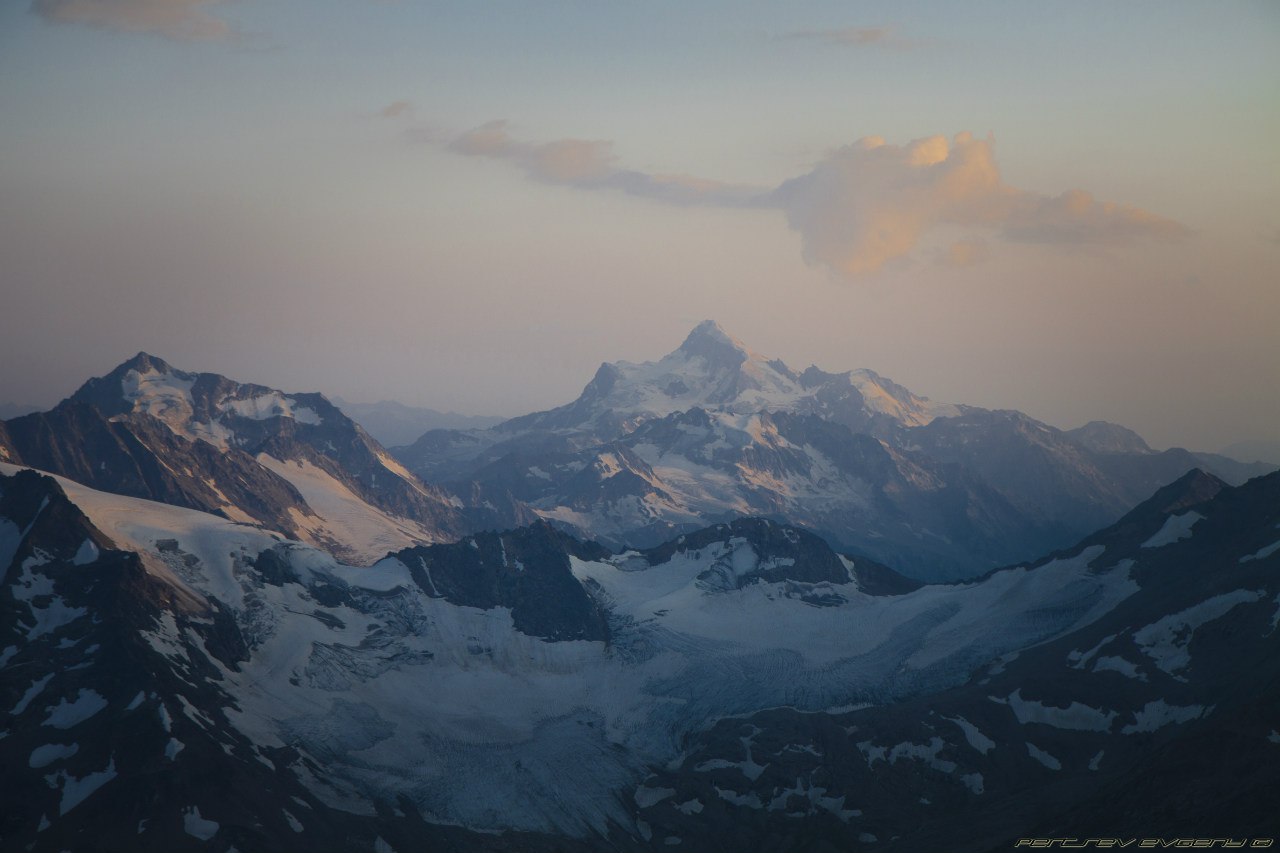 Это такая красота, десятки фонариков, летящих по Косой полке - гора с огоньками. Они манили и звали вперед. Мы шли и шли по темноте, и тут я почувствовала, как начинают мерзнуть пальцы на ногах. Мерзнуть, а потом болеть. Стиснув зубы, я ждала рассвета. И вот они - первые лучи солнца, розово-желтые отсветы, разноцветные тени гор, волшебный свет с обеих сторон. Мы остановились на Скалах Пастухова, там в первых лучах солнца грелся монохромный пушистый пес (вроде, он живет на Приюте). На косой полке солнце уже играло вовсю. Вершина была открыта, Горы вокруг были нагими и поражали величием. Эльбрус нас ждал, погода была идеальной. С такими видами холодный ветер казался не таким уж и страшным. В этот момент, стоя на Косой Полке, я знала, что мы поднимемся наверх. Да пусть на меня поругаются, я знала что мы зайдем на обе вершины.
