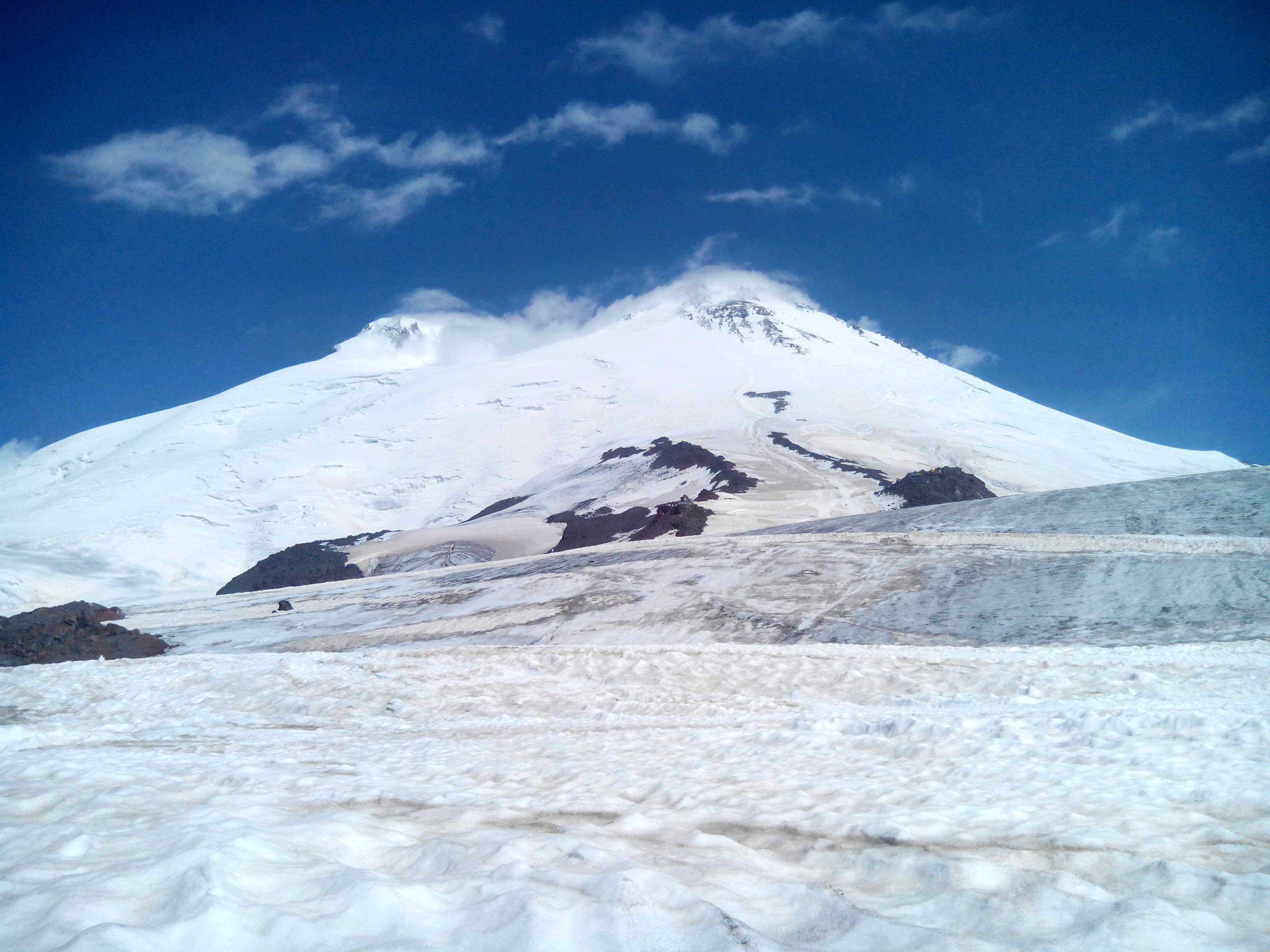 Странно. По пути на Западную тьма народу, яркие, цветные, громкие. Тех же, кого мы встретили по пути на Восточную, можно пересчитать по пальцам. Перед плато мы догнали Борю с Олей. А в начале плато сидело трое ребят, двое из которых не могли идти ни вниз, ни к вершине, до которой совсем рукой подать. Они рассказали, что накануне в этом районе пропал человек, который просто вышел из палатки ночью в тумане в туалет, на пять минут. К тому моменту его уже искало МЧС. Светило солнце и был почти штиль, но стоило пройти несколько шагов, как резко похолодало и откуда-то взялся сильный ледяной ветер. В ход пошел и пуховик, и лыжные варежки. Пришлось долго приноравливаться к попаданию на кнопку с оооогромными пальцами. А команду, которая была с нами на вершине, руководитель заставлял фотографироваться с ленточками