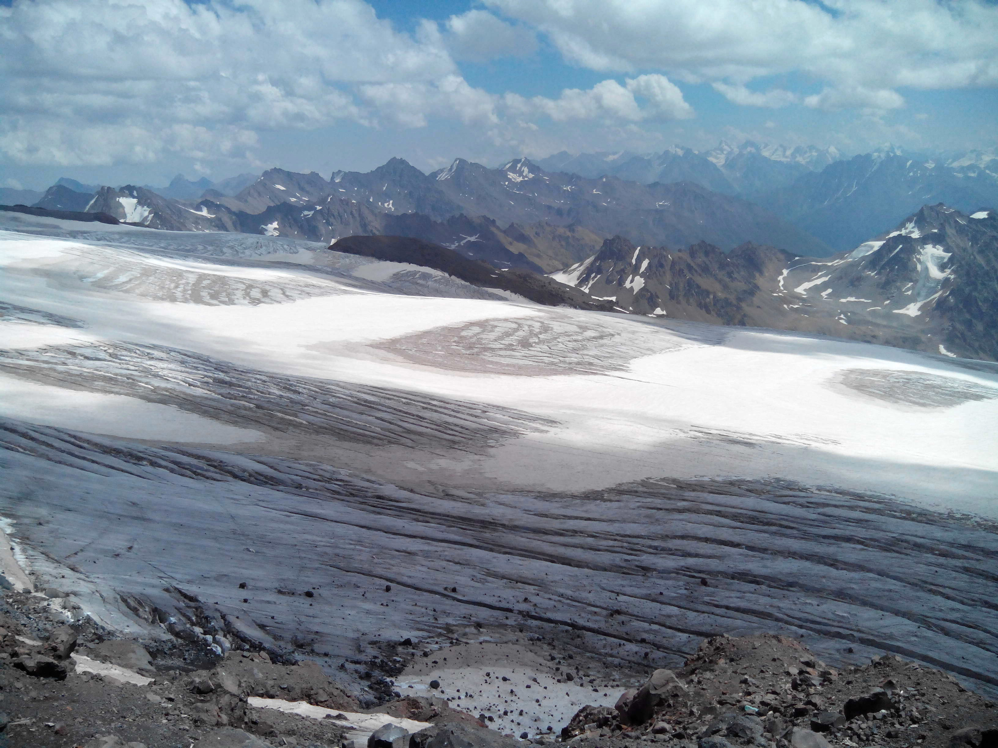 В тот день мы расссчитывали просто переехать с бочек на Приют 11 и начать акклиматизацию, собрав остатки вещей в рюкзаки. На второй день этот путь казался легче и быстрее, видимо постепенная акклиматизация всё же сказывается на организме. Поев, мы решили идти вверх, погода была прекрасной, ярко светило солнце и мы решили - минимум - скалы Пастухова, а так - куда дойдем - туда дойдем. Заодно проверим кошки. Женька включил музыку и мы отправились в путь. Уже к середине пути Женя начал считать шаги. Так правда легче, чем выше - тем меньше и совсем чуть-чуть отдыха. И организму проще - когда мозг знает, что через 15 шагов пауза. И легче держать дыхание в относительном спокойствии. И глаза постепенно начинают прозревать.