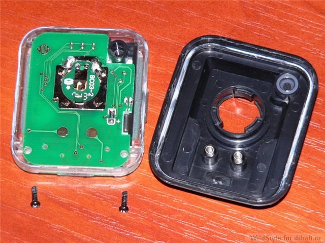 2. Тем же ножом лезем дальше, аккуратно поддевая прозрачный корпус и отделяя его от задней крышки. Тут придётся приложить некоторые усилия, ибо корпус приклеен. Как оказывается, приклеен он не везде равномерно, поэтому открываться начинает с углов, и стоит только поддеть один из них — считайте дело сделано. Как открыли — выкручиваем 2 винта, и печатная плата у нас в руках.