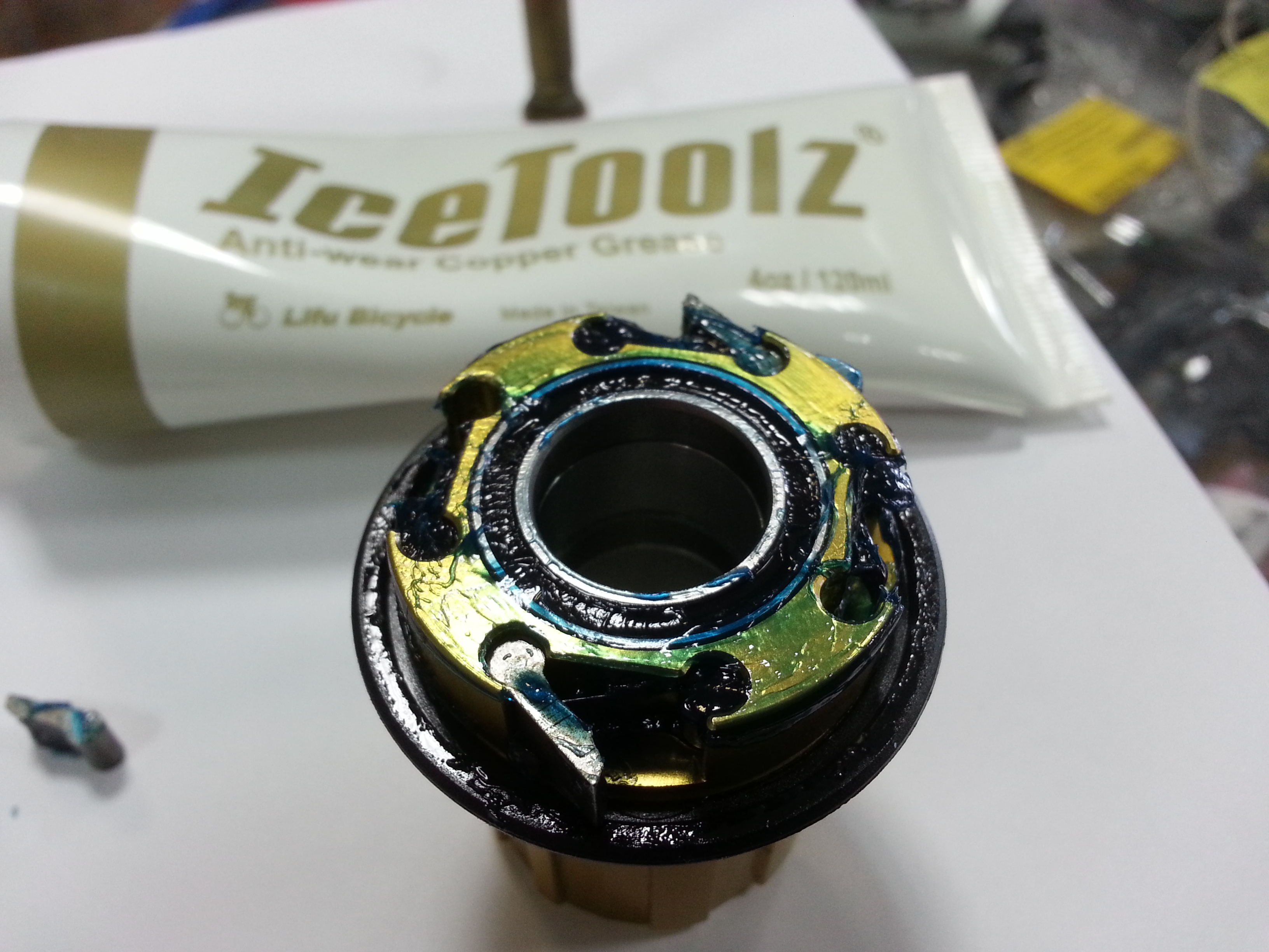 Самой вязкой и подходящей смазкой по моему мнению будет медная IceToolz. Её и было напихано вдоволь на зубья трещётки (для контраста на фото покрыта половина барабана):