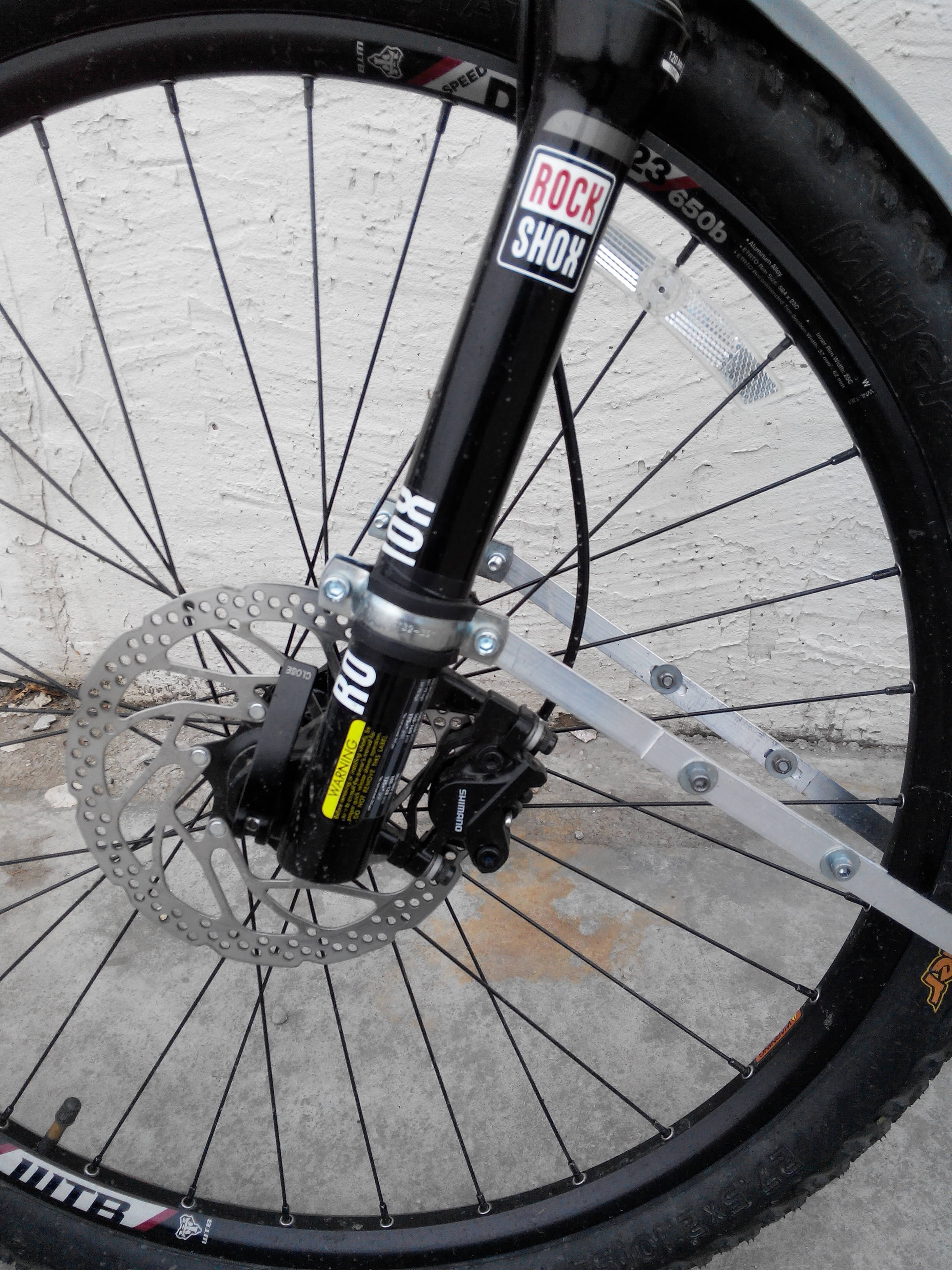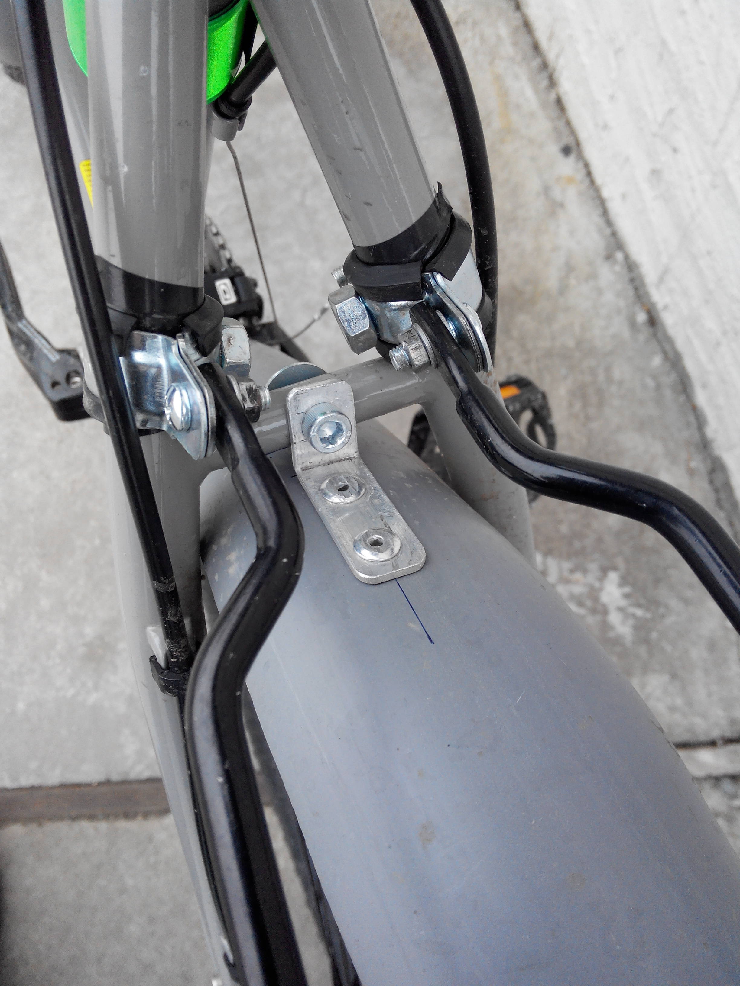 После того, как крылья готовы, нужно сделать крепления. Т.к. крепления для полноценных крыльев на нормальный МТБ не делают, делаем их сами! Вилка РШ - ставим 2 хомута для сантехники, между полукружьями зажимаю тяги. Я их сделал из алюминиевой пластины, аккуратно согнутой на бутылке, можно и из прута, но нерж не нашел, а алюминиевый самый тонкий был 5 мм и стоит в мурлене 86, а пластина - 33, и согнуть прут в 5 мм - то еще удовольствие. Я решил сделать их регулируемыми, пригодилось. К горилле крепление очень простое - две пары отверстий, пара хомутов и готово. Заднее крыло дополнительно крепится к багажнику.