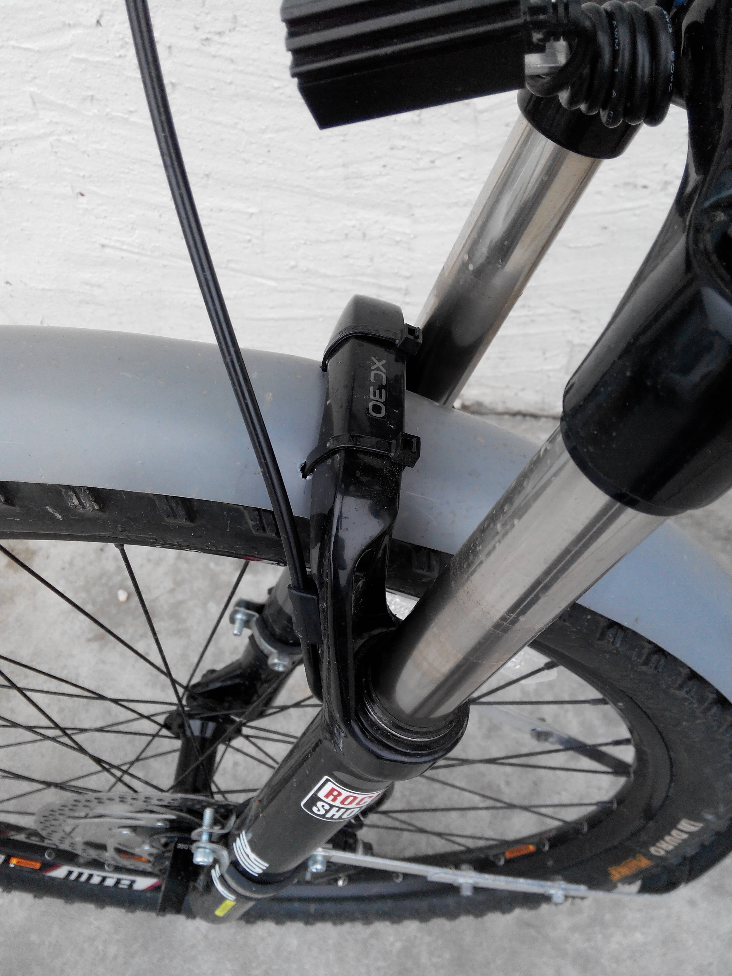 Додумав подсмотренную на ютубе технологию из пластиковых труб, сделал сам следующим образом - купил 2 м трубу серого цвета (вышло как раз в цвет рамы!), распустил вдоль ножовочным полотном, получил 2 желоба. Разделил неравно пополам один желоб - 1200 мм на заднее крыло и 800 мм на переднее, с учетом диаметра колес 27,5, толщины покрых 2,10 - самое то.