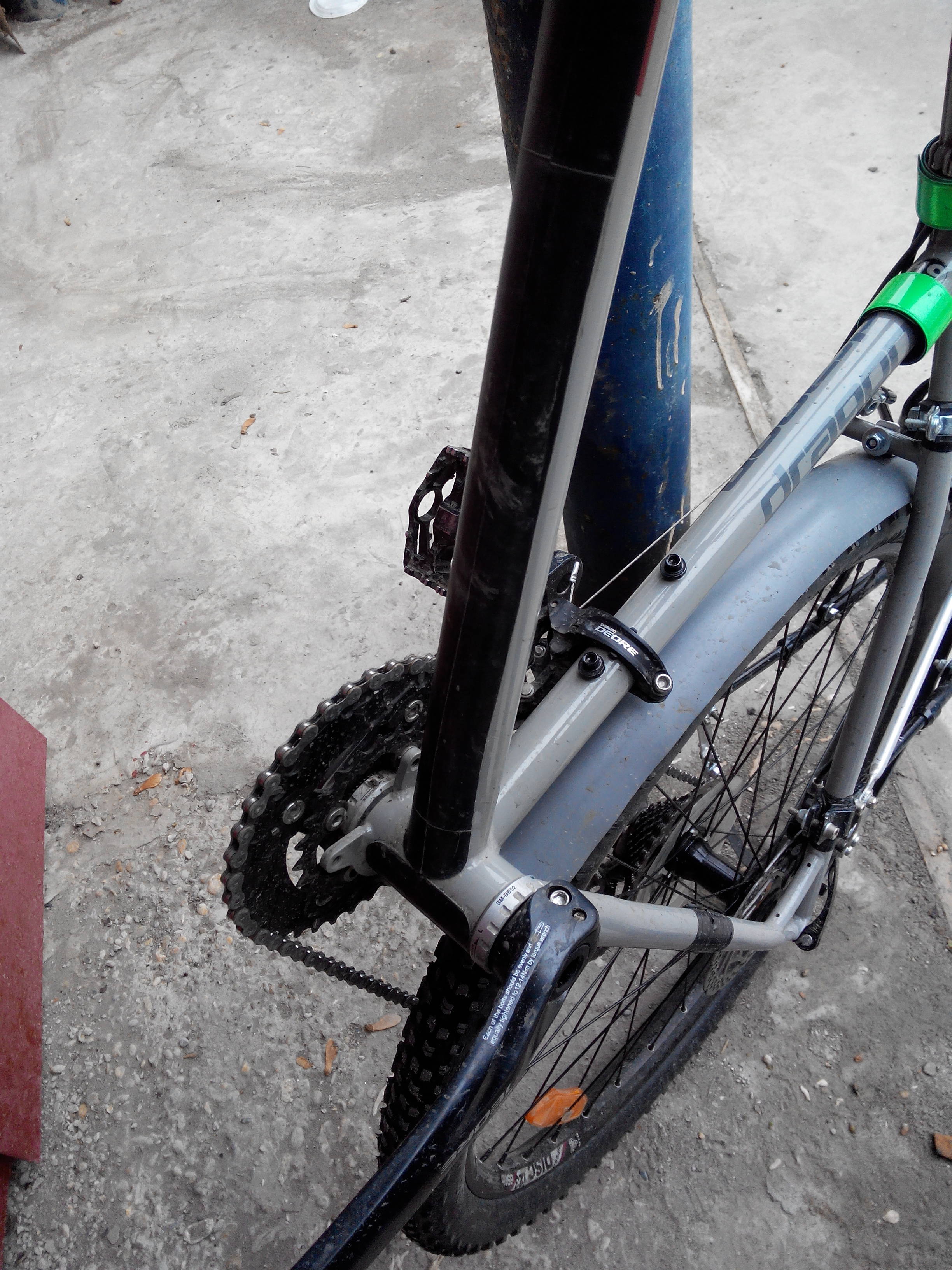 Ну раз вел перевернул, заодно наклеил защиту на кареточный узел и нижнию трубу из разрезанной камеры. Обычный Момент, желтый, большой тюбик - на заранее вырезанную и обезжиренную ацетоном резину наносим тонкий слой клея, откладываем в сторону. На ответные и обезжиренные поверхности на раме тоже наносим тонкий слой клея, ждем 15 минут, греем место приклейки на раме строительным феном и тут же наклеиваем резину, сильно прижимая.