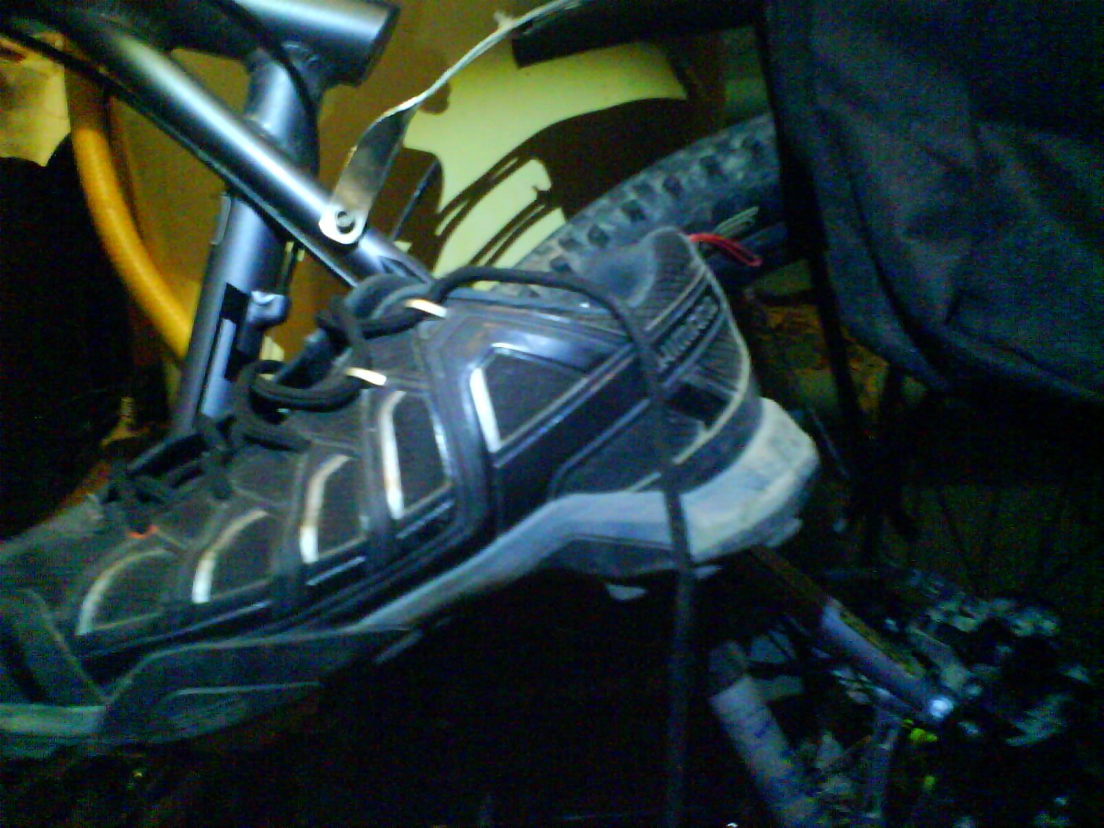 Т.к. на момент сборки конструкции, была дождливая погода, и проехать не мог я по улице, я вставил велотуфли в педали и прокрутив по кругу педали, убедился, что пятки велотуфли не задевают велоштаны.