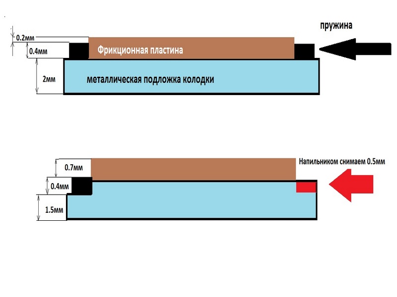 На вернем рисунке видно что остаток фрикционной части до пружинки всего то 0.2мм. Если взять напильник и сточить металлическую подложку (например на 0.5мм) то тем самым мы увеличим растояние между пружинкой и краем фрикционной накладки так же на 0.5мм. На нижне рисунке показано изменения после обработки напильником. Рабочая часть накладки =0.7мм(вместо 0.2мм) Если толшина фрикционной части новой колодки равна 2 мм то из остаточной толшины 0.2мм(10%) мы получили 0.7мм(а это 35%) от новой колодки!