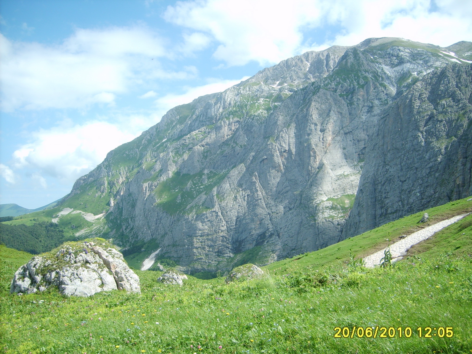 Ночь прошла в полузабытьи, Максу было холодновато, а мне вроде нормально, но все равно-чувствовалось, что температура пала ниже +10. С рассветом лагерь стали будить громкими противными голосами организаторы, я не хотел вставать и лишь фраза "каша готова" заставила меня вылупиться из спальника. Так как мы все там голодали, то пропускать очередную порцию баланды не хотелось, к тому же это был последний основательный перекус. Сделав все дела, съев побольше пшеной баланды (Макс Швед даже не смог доесть-не захотел представлять себя поросенком), запив все чаем и ледяной водой из странной кипящей реки, собрали наши пожитки, погрузили в машинуи, построившись нестройной колонной, поехали вперед на своих железных конях. Ехали метров 30, а дальше начался поход. Вообще, эта ПВД называлась "Через горы к морю или веселый спуск" и позиционировалось, что на маршруте идет преимущественно именно спуск. Но как день начался с подъема, так оно и продолжалось почти до самого конца. Итак, по-порядку. Впрягшись, вся процессия поперлась медленно вверх по тропе, везде был чернозем, после дождя земля прокисла, а растительность по пояс была пропитана влагой. Поэтому вся одежда и обувь моментально промокли. Мы все себе сделали из Евгешкиных мусорных пакетов (спасибо, Евгешка, ты нас спасла!) портянки, и так уже хотя бы ноги не промокали. Там же попался первый брод, который еще пытались перейти, не замочив ног.Опыт пеших подъемов с великом нам здорово помогал, Новороссийская группа была в голове колонны, остальные стали безбожно отставать, покрываясь испариной, мучаясь от одышки и волоча за собой свои ДХ ведра. Спустя минут 40 выползли на некое подобие смотровой площадки и прошлись по первому снежнику. Снег лежал во множественных ложбинах и зрелище было просто обворожительно нереальное! Только представьте себе-вокруг лето, разноцветье трав, земляника, и тут же рядом в метре-другом в ложбинке со снегом ранняя весна-растут деревца, на них только-только распускаются листочки, верба только распушила цветы и сквозь прогалины виднелись подснежники. Лично я такого резкого контраста сезонов никогда не встречал. Сам Фишт величаво возвышался слева, вершину уже начинали окутывать облака, а снег блестел бриллиантовой поверхностью на отвесных склонах. Я попытался как можно дольше насладиться этим видом, чтобы картина врезалась в память. Немного перекурив, двинулись по тропе дальше. Ехать удавалось очень мало, тропа была в виде глубокой и узкой колеи, за края которой цеплялись педали, то тут, то там среди колеи выскакивали огромные камни, так что рамы и шатуны коцались неимоверно! Ведущий группы (ПНЛ) сообщил нам, что нужно дойти до Черкесского перевала, а там будет легче и там на Лунной поляне всех подождем. Положительным моментом было наличие радиостанций, которые выдали группам, в том числе и нашей группе (Новороссийцам). В общем, пошли дальше в гору, тропа петляла и извивалась как змея, иногда вовсе пропадая. Поднимаясь все выше и выше, я увидел вдали огромные горные кряжи, вершины были покрыты снегом и вся картина завораживала своей красотой. Невозможно было оторвать взгляд от синевы этих гор. В воздухе повсюду летали какие-то мухи, их было так много, что они напоминали снег, только падал он снизу вверх. Мушки неприятностей не доставляли, а вот жопогрызки кусали прилично. Еще осо