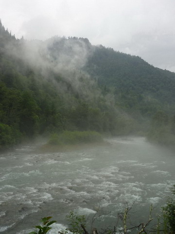 Долина в этом месте широкая и пологая, ущелье расступилось, река настолько обнаглела, что течет прямо по лесу, но нисколько не мешая нам (она течет сбоку от тропы):