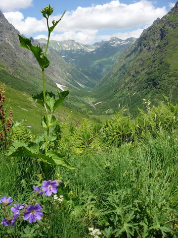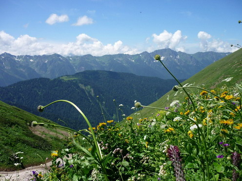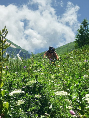 После спуска в долину, когда справа по ходу нашего движения зажурчит маленькая еще речушка Малая Лаба, альпийская травка сменится субальпийским разнотравьем, которое будет преследовать нас по пути почти весь поход, на участках где не будет леса. И это не есть плюс, так как тут встречаются не только красивые цветочки, но и всякая колючая порнография выше человека ростом