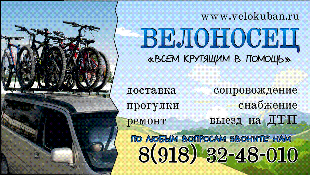 Уважаемые коллеги велосипедисты, пользователи сайта "ВелоКубань"..! Начиная с момента публикации мы предлагаем вашему вниманию комплексную транспортную и технологическую поддержку любых ваших велосипедных начинаний и свершений, включающую в себя организованную и комфортабельную доставку краснодарских и иногородних велосипедистов при помощи наших "велоносцев" (автомобилей тех.поддержки) к любым, нужным вам, пунктам назначения на территории Краснодарского края и республики Адыгея, на пляжи курортов Черноморского побережья, на склоны гор Кавказского хребта, а так же и в любые другие места и регионы для самостоятельного времяпрепровождения с возможностью последующей доставки обратно в Краснодар или другие населенные пункты.