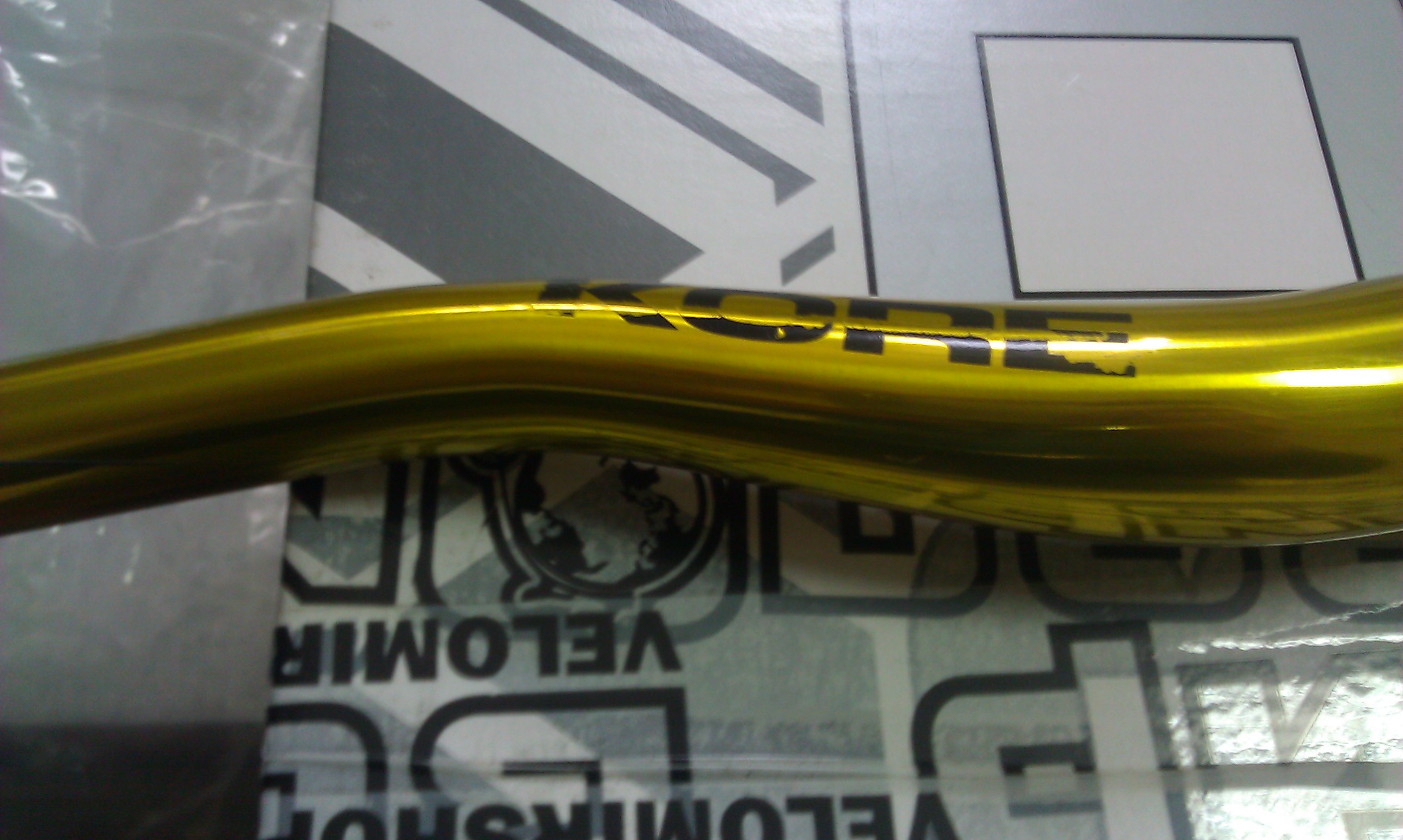 Заказал в магазине ВелоМир руль Kore Torsion ED 800x31.8 Gold, менеджер связался со мной по почте, выслал счет на оплату, я оплатил и заказ поехал Автотрейдингом в Краснодар. Отпросился с утра с работы, забрал посылку. Руль был надежно упакован в коробку из под вилки, плотно прижат картоном и добротно обклеен скотчем. Упаковка чистая, ровная, без вмятин, нареканий по транспортировке нет. Приехал на работу, начал рассматривать и..... полный ОБЗАЦ!!!!