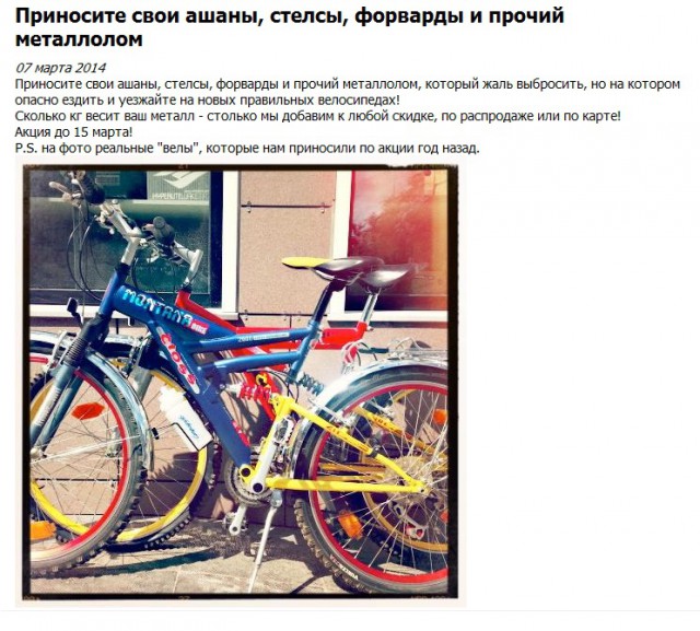 Суть акции в том, что 1кг сданного велосипеда равен 1% скидки на покупку нового велосипеда.