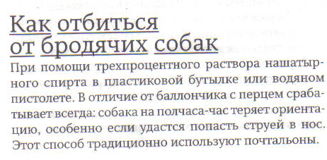 В одном из журналов наткнулся на информацию о том как почтальоны поступают при встрече с собаками. Отсканировал - читайте (см.фото). Может кто опробует раньше меня? Жду отзывов!