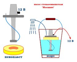 Насос стеклоомывателя автомобиля "Москвич" извлекается из бачка омывателя и помещается на кольцо из пенопласта и затем опускается в ведро или любую другую емкость с водой. Насос плавает в ведре на пенопласте по поверхности воды и опускается вместе с уровнем жидкости, пока не выльет её всю... Удобен тем, что не требует возить в машине ничего лишнего, кроме удлинительного провода и трубки с душиком на конце. Может плавать не только в ведре, но и в озере или в реке...