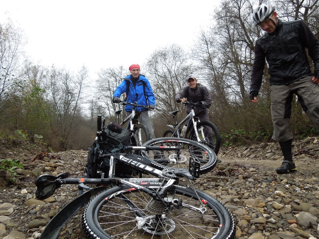 ...к 17.20 доезжаем до Нечипсухо и огородов Подхребтовки, моем велы (от крупной керамики), стремительно темнеет, ставим свет, Витя угоржает в рацию, Самвэл благоразумно заблудился и не выходит на связь, Лёха подозрительно бодрый и велосипед у него чистый - мистика какая-то.. :blink: