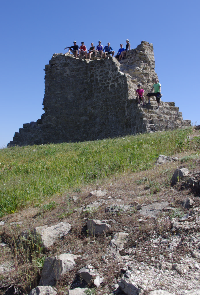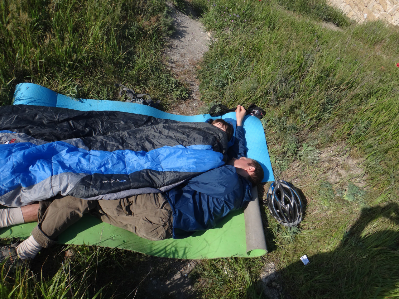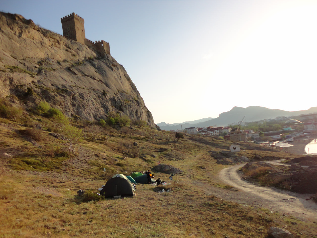 Парни затолкали наши велики на поляну у подножия крепостных стен и у нас была впервые возможность поставить лагерь засветло! Мы не стали упускать эту возможность, и, поставив палатки, развалились на травке, нежась в лучах вечернего солнца… Кто-то подремывал, кто-то потягивал винишко, кто-то наслаждался массажем, кто-то осматривал окрестности…. В этой неспешности мы готовили ужин и часть нас ходила смотреть закат на край света. Об этом чуть позже.