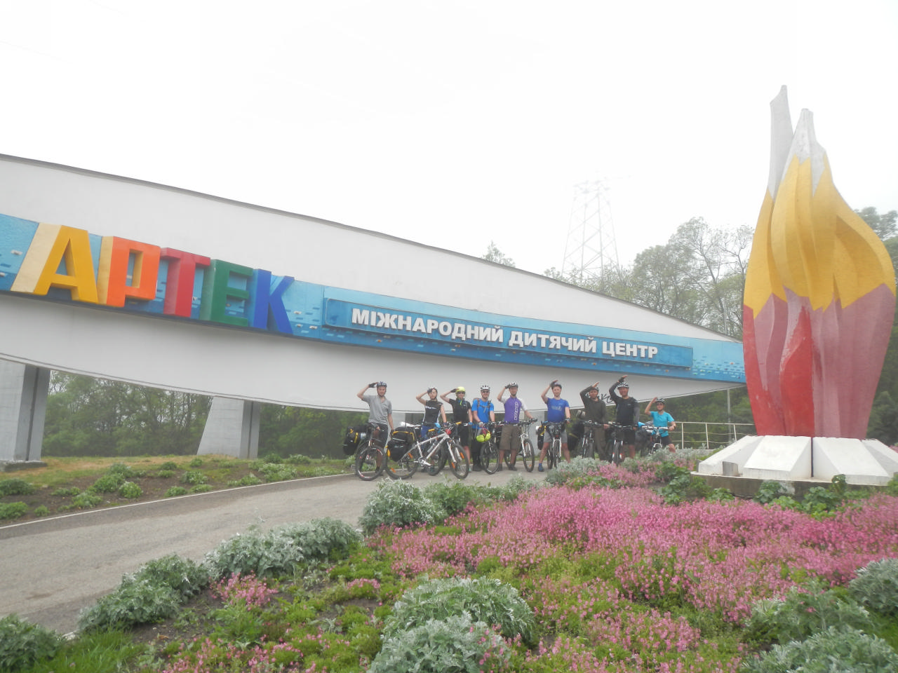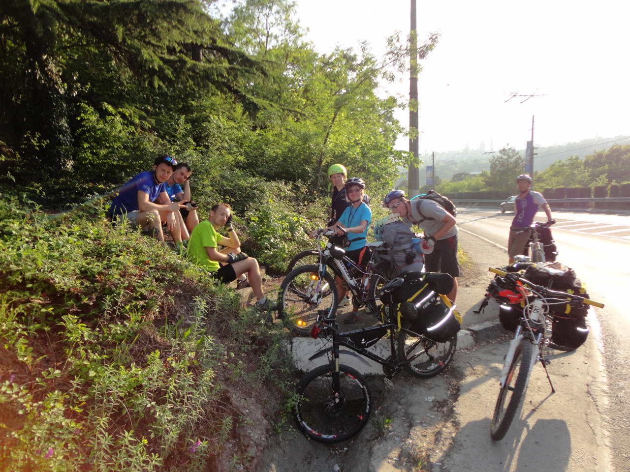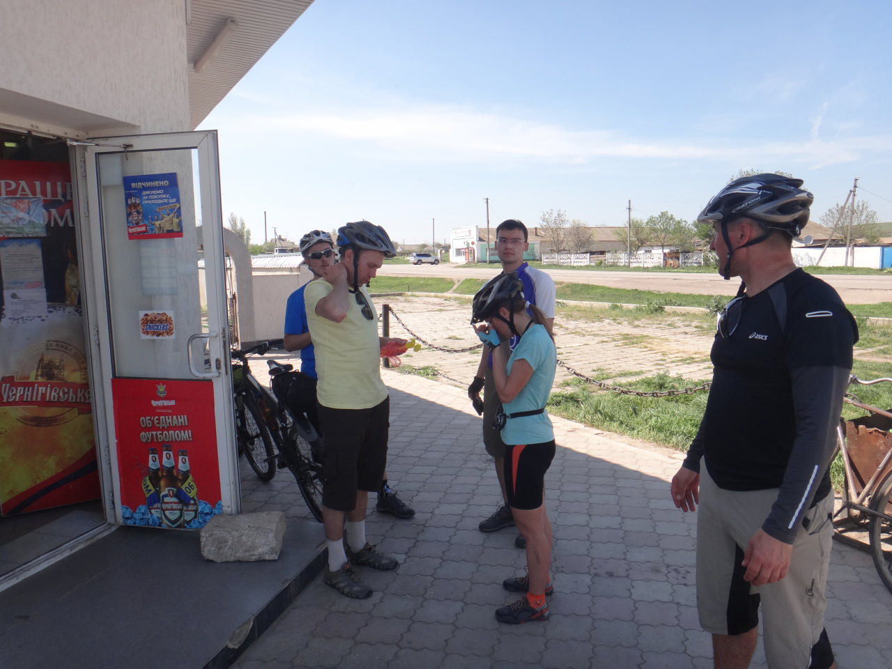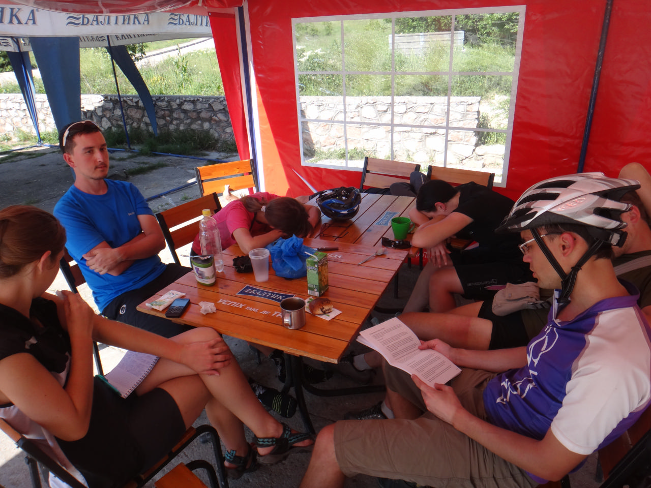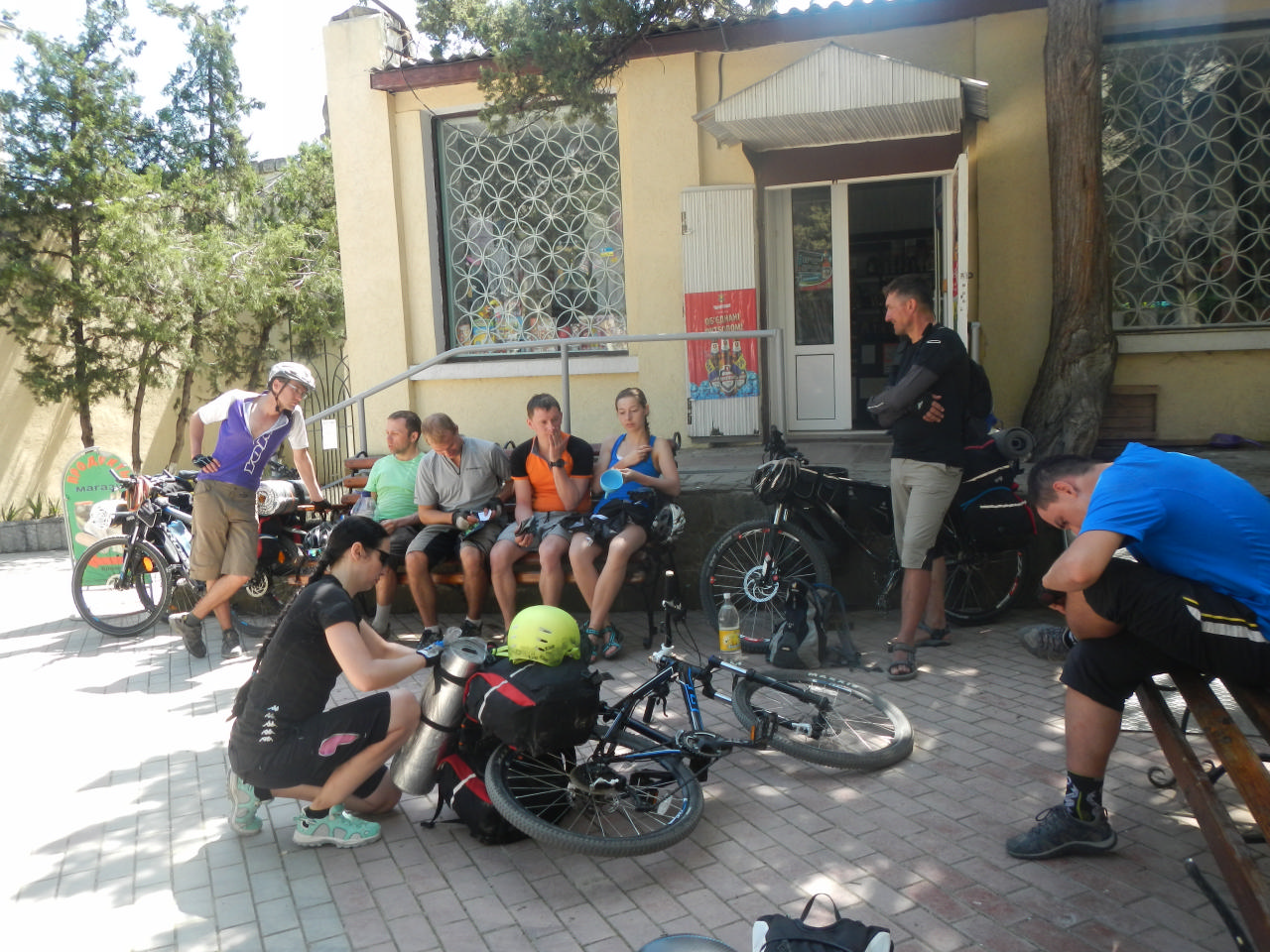 Жара была жуткая, что мешало ехать. Силы были на исходе – мы остановились перекусить возле заправки, поехали дальше. Снова ехали… Жара, безусловно, всех вымотала. За день мы накрутили больше 70 км. Обед мы устроили возле придорожного магазина за столом, под навесом. Когда мы подъезжали к нему, оттуда выдвинулась во встречном направлении группа велосипедистов, которые предупредили нас, что лучше не наедаться, потому что потом все захотят спать, а не крутить. Мы же наелись, напились и стали слушать Димин рассказ про Форос, обсерваторию, Воскресенскую церковь и Байдарские ворота… Некоторые из нас оказались очень внимательными слушателями и, чтобы информация лучше усваивалась, заняли горизонтальное положение на стульях и лавочках…