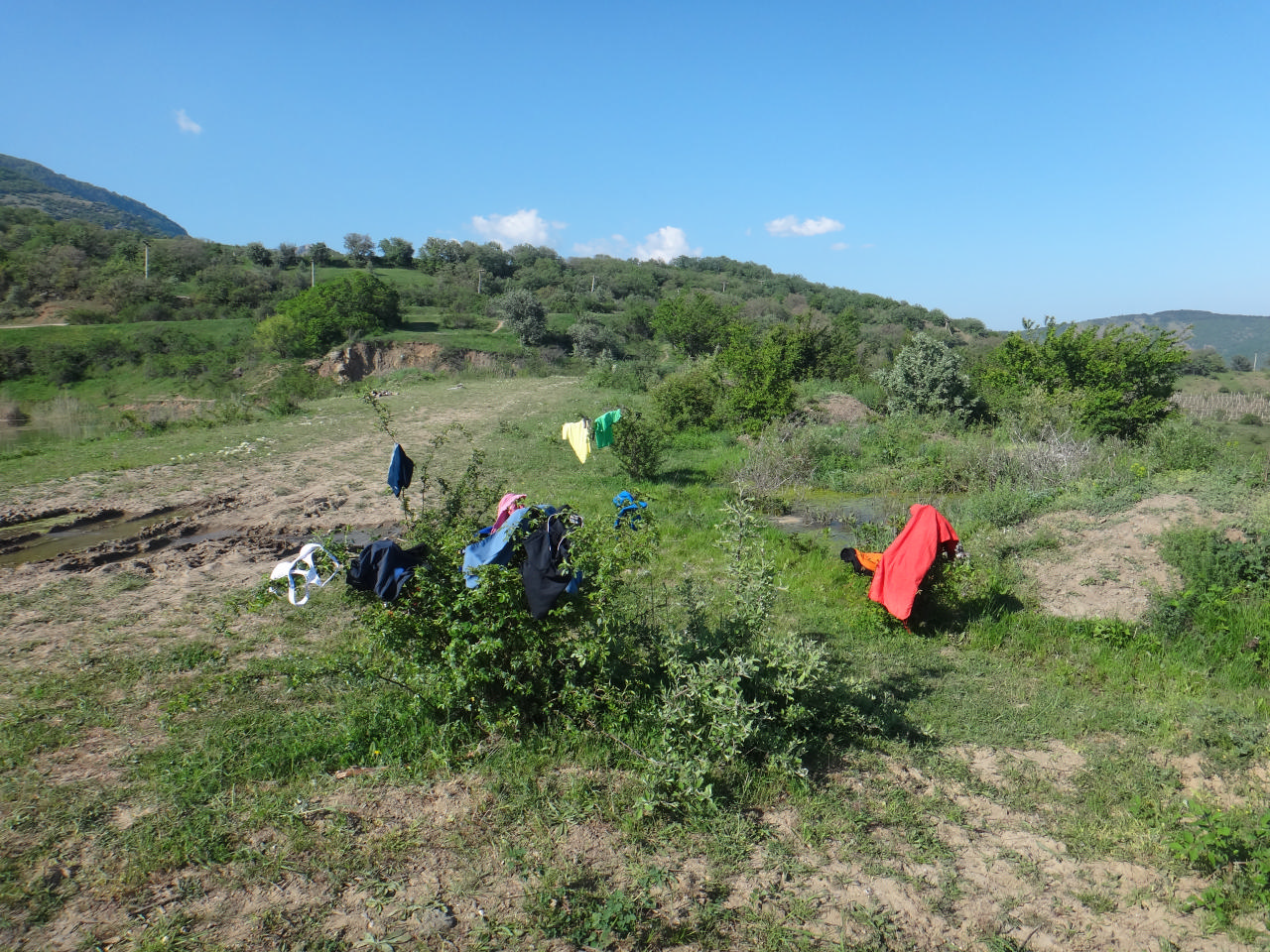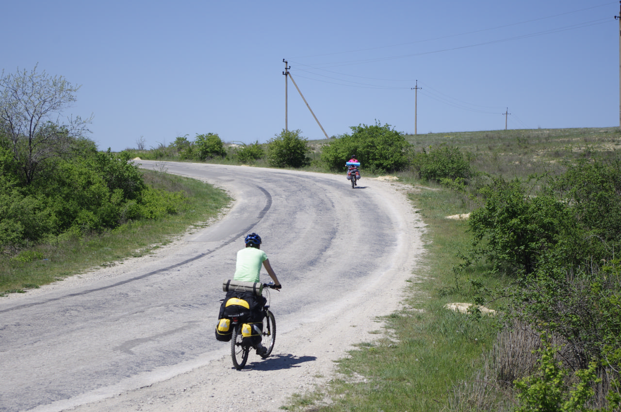 Жара была полезна нам лишь в том, что мы не зря набрали защитных кремов и в том, что у нас была возможность досушивать вещи на велоштанах – Лариса и Игорь активно использовали эту методику, поэтому ехавшие позади них могли изучить гардероб вышеназванных досконально )