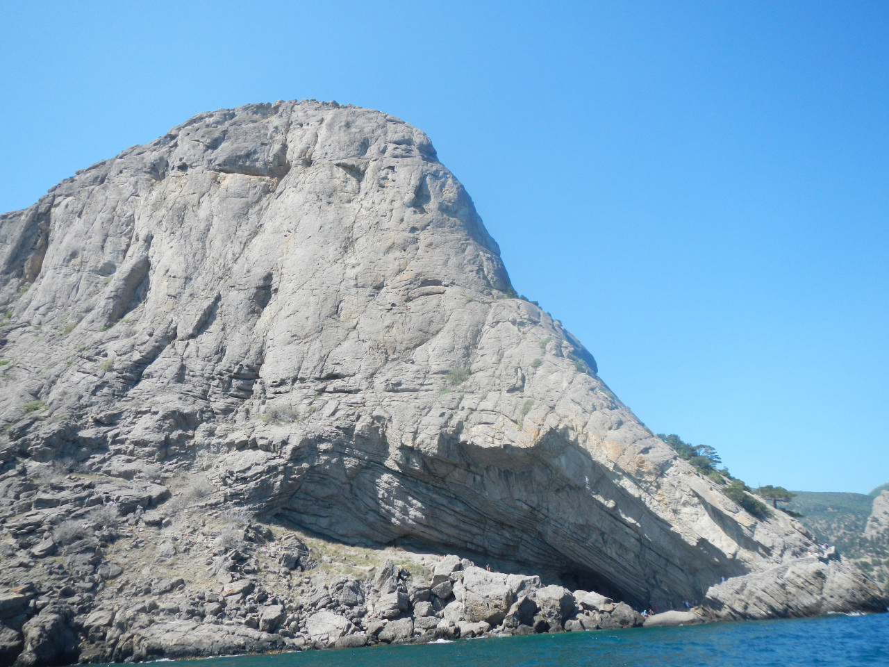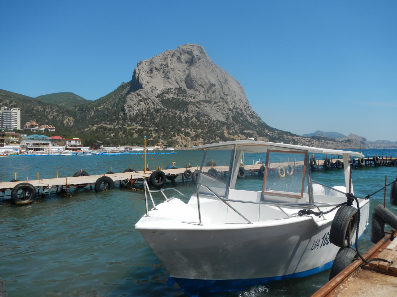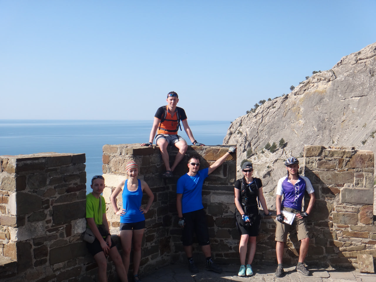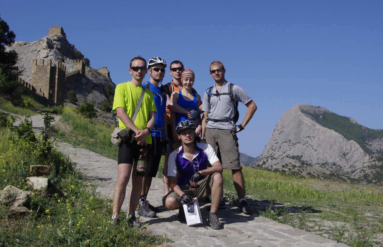 [spoiler]Дежурные Олег с Игорем. На завтрак каша. Лариса ушла купаться в море утром, что было весьма самоотверженно. По возвращении она рассказала нам о крепости, в которую мы и направились. Тут был для нас простор! Шурик, Лариса и Андрей начали все размеренно осматривать, фотографироваться, остальная же часть команды направилась быстрее к краю крепостной стены, на самый верх. Нас предупредили, что это опасно и по идее запрещено. Но, естественно, от этого наш интерес лишь усилился. Самые стойкие добрались до Девичьей башни (в последствии Сережа назвал ее Девственной), я же предпочла спуститься к велами и малость подкрепиться в тени. После того, как осмотр был завершен, мы выехали в Новый Свет, где перед нами стал вопрос, как ехать дальше: своим ходом или на катере. После ожиданий, раздумий и сомнений мы загрузили велы в катер и помчались! Надо сказать, что груженный катер несколько страшно плюхается о волны, а ветер вовсе не кажется таким теплым, как на берегу. Конечной точкой нашего мини-путешествия стало Морское, по пути же мы могли видеть то, что не увидели бы с берега – Голицынская тропа извивалась прямо по краю скалы близ моря, по ней суетились люди, а мы видели картину в целом, со стороны.