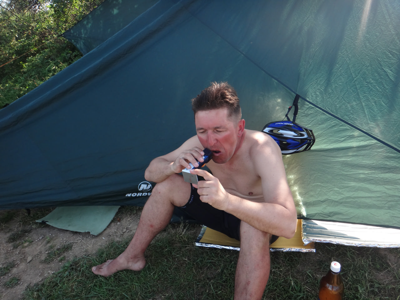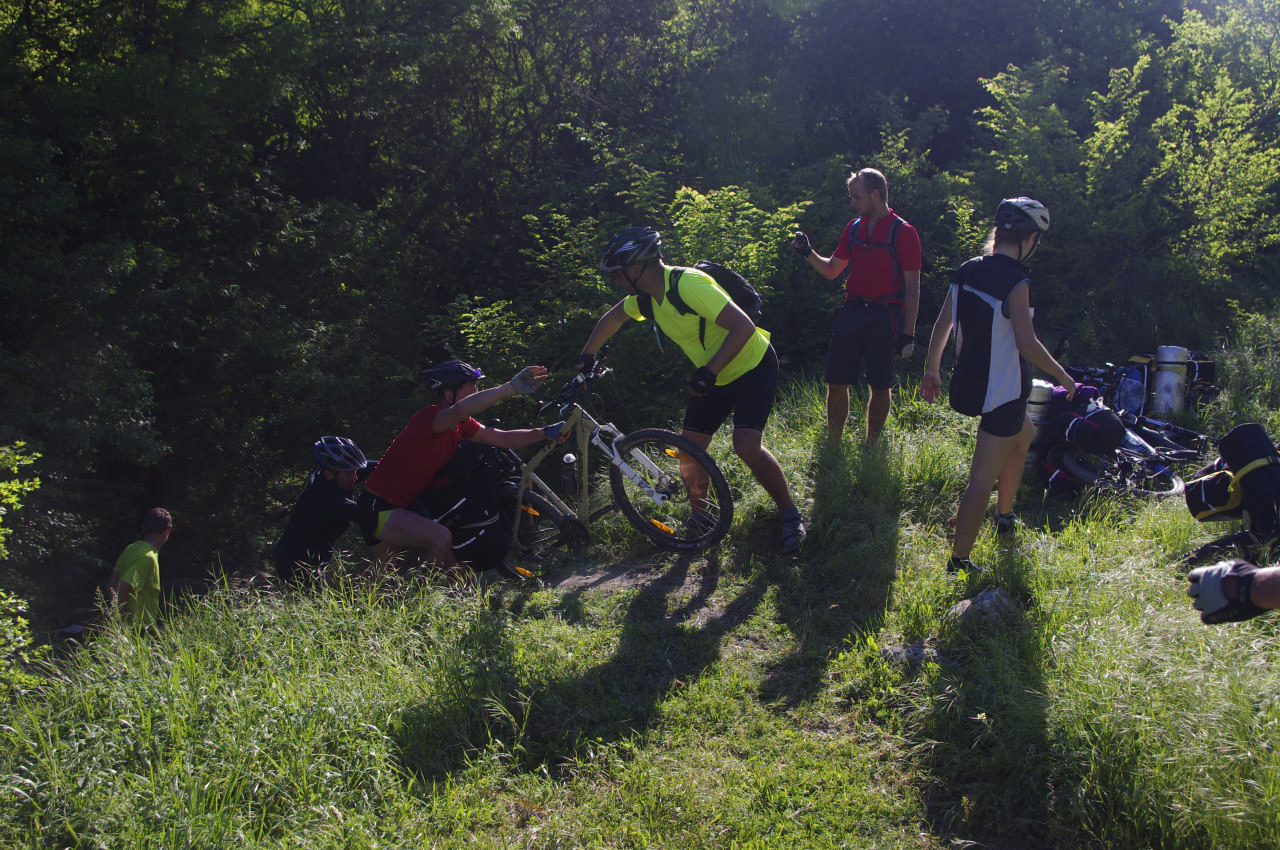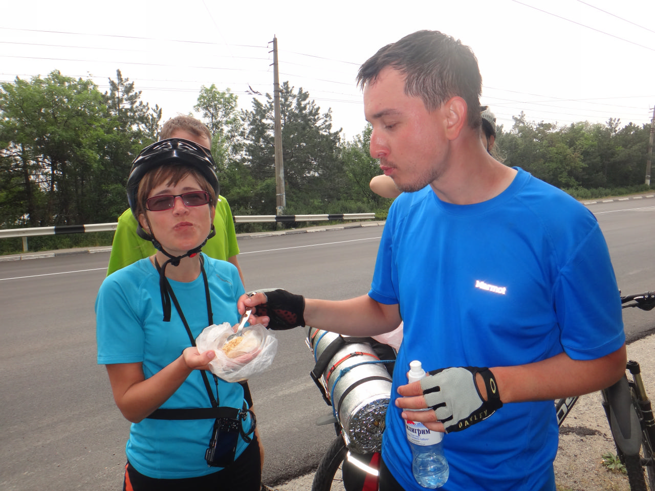 Путь был насыщенным: перекус на обочине, а затем – менее радостное событие – Сережа чебурахнулся прямо на ходу, вовлек в эту ситуацию Олега, ехавшего за ним. В итоге – мгновенно образовавшаяся шишка у Сережи на ноге и опечаленный Олег рядом.