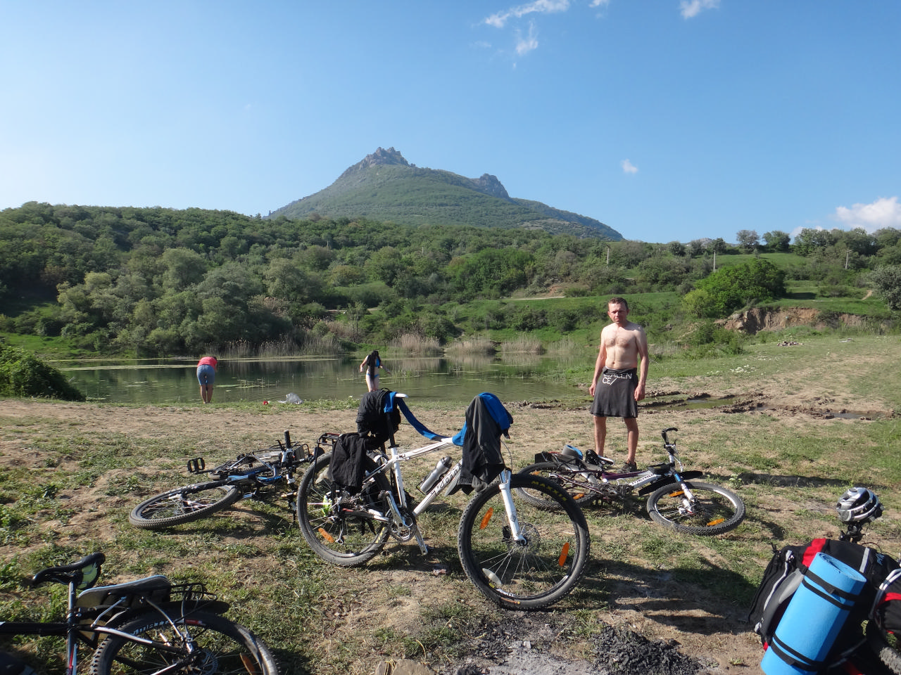 Так вот, все-таки доехав до пос. Лучистое и обнаружив рядом с ним озеро с родником, Олег решил не утруждать себя подъемом к долине приведений и поматрасить на озере. Я и Дима самоотверженно вызвались помогать Олегу сторожить велоштаны наших соратников, за что последние были нам очень благодарны – им представилась отличная возможность крутить на гору налегке. Нам заботливо отдали остатки еды, чтобы мы могли пообедать, а сами они должны были закупиться обедом в магазине. Итак, вся наша компания за малым исключением отправилась посмотреть ту самую труднодоступную и загадочную Долину Приведений… Каково им там было судить я могу лишь по фото, поэтому поведаю о том, о чем могу судить, исходя из личного участия. Оставшись втроем на озере, мы с удовольствием вошли в роль енотов-полоскунов, перестирали свои вещи и искупались сами. Тент нам очень пригодился – благодаря ему, мы смогли насладиться обедом в тенечке, на пенках, не спеша и абсолютно чистыми и свежими. Была даже возможность вздремнуть. Через некоторое время послышались знакомые голоса и все прибрежные кусты оказались заняты свежевыстиранными шмотками наших товарищей ) Массовое купание и рассказ о Долине Приведений даже дали возможность Андрею воспользоваться электробритвой (а кто-то смеялся с Алининого фена)!