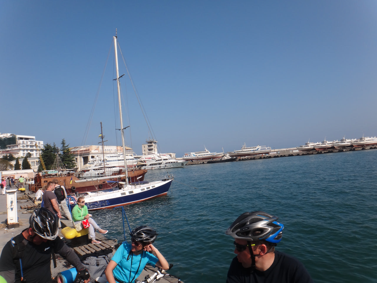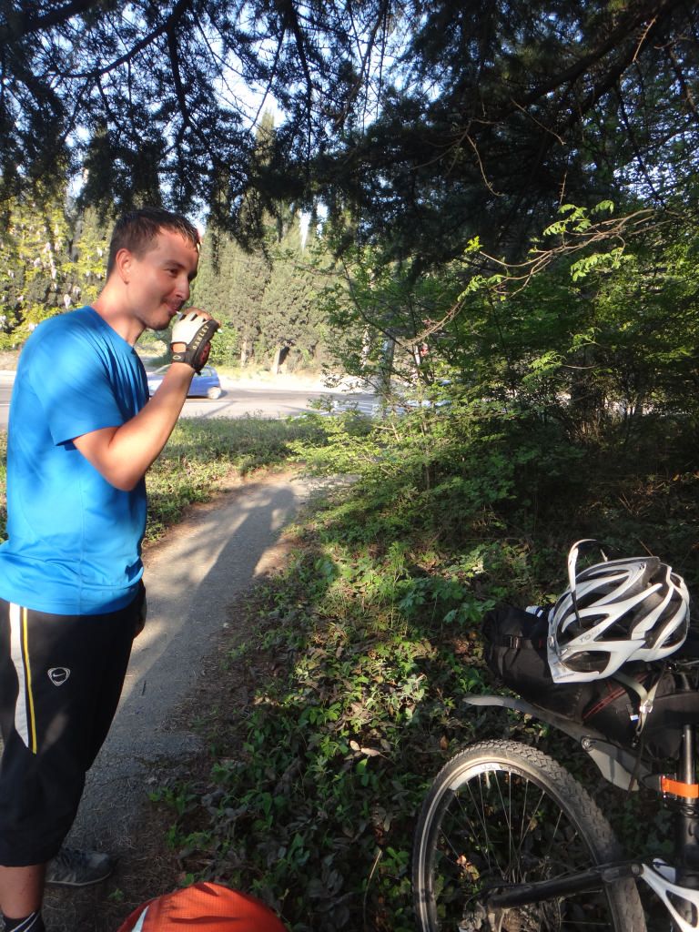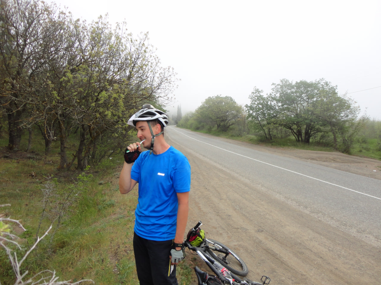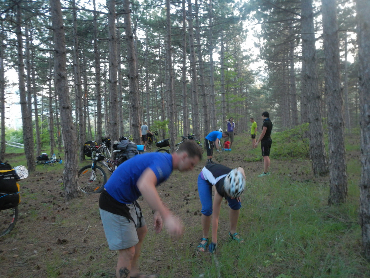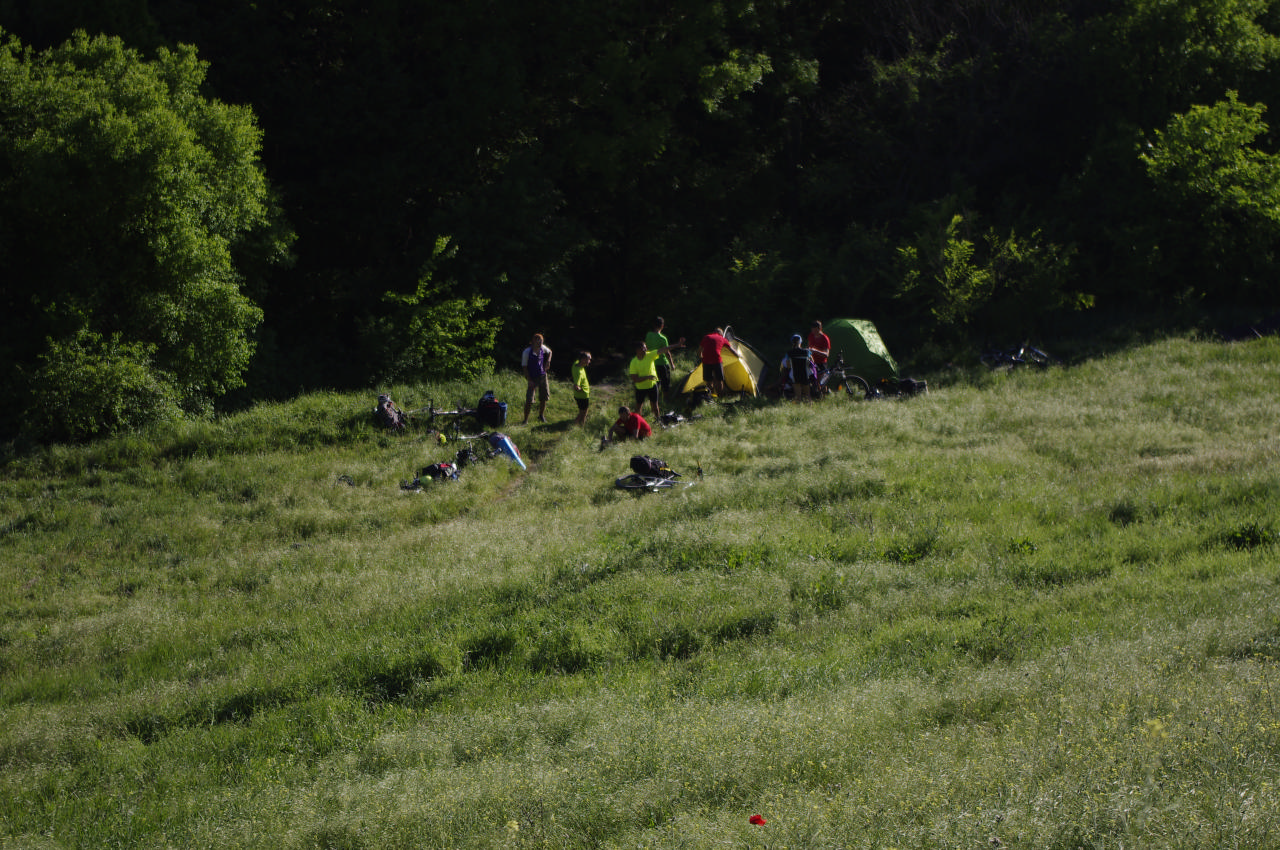 Ялта встретила нас шумной набережной. Она кишила людьми, детьми, яхтами, шумом, подготовкой к какому-то концерту… Мы с Сережей устроили свой концерт, а после все пришли к мнению, что делать нам в центре нечего. И, посетив АТБ, мы двинулись за город. Шурик с Андреем проехали вперед, мы их ждали достаточно долго. Успели и послушать музыку, и пофоткаться, и понаблюдать, как Олег чистит зубы… Ну вот наши вернулись и попытались нас огорчить тем, что нет подходящего места поблизости. В итоге мы остановились в узкой лесополосе близ трассы. Но разве это нас могла расстроить? Мы были в отличном расположении духа, нам было вместе интересно, у нас был вкусный ужин, а еще сегодня была Пасха! Пока готовили ужин, Лариса расспрашивала Диму о том, как он решил купить себе велосипед, откуда он знает Пашу и о прочих важных моментах его жизни. Паша смастерил торт, который украсил надписью «Х.В.», что заменило нам на сегодня куличики и выпили немного вина, что было сопровождено глубокой речью Ларисы. Надо отдать должное Диме с Пашей – каждый вечер после установки палатки, они приходили на кухню и помогали нам, не смотря на то, кто был дежурным. И делали это отменно ) Единственное, что Паше не везло с котлами: замечали мы за ним необыкновенную способность проливать их содержимое )