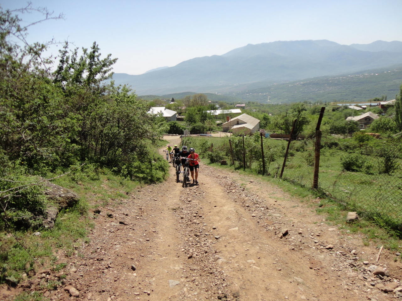 На этом приключения не закончились – перед спуском, который обещал быть чудесным, я остановилась что-то поправить, остальные проскочили далеко вперед и только Паша замешкался позади меня, за что я впоследствии была ему премного благодарна. Едва я начала спускаться и набрала хорошую скорость, как у меня рвануло колесо! До этого мы с Олей соревновались, у кого из нас будет больше проколов и шли вровень, а тут у меня просто протерлась резина… К моему счастью, управление я не потеряла, осторожно остановилась с вытаращенными глазами, ибо до меня не сразу дошло, что это такое громыхнуло, ну а следом за мной остановился и Паша. Он помог мне поменять камеру и залатать изнутри резину куском старой камеры. Да что там помог! Все это сделал он, а я просто заглядывала ему через плечо и давала «дельные» советы. С нам вышли на связь, спустя некоторое время. Мы сказали, что заканчиваем и скоро будем. Едва мы тронулись, как увидели Сережу и Шурика терпеливо подымающихся нам на встречу. Они проехали этот спуск во второй раз… Внизу мне замотали изолентой колесо и дальше я ехала так, резины запасной не было ни у кого.