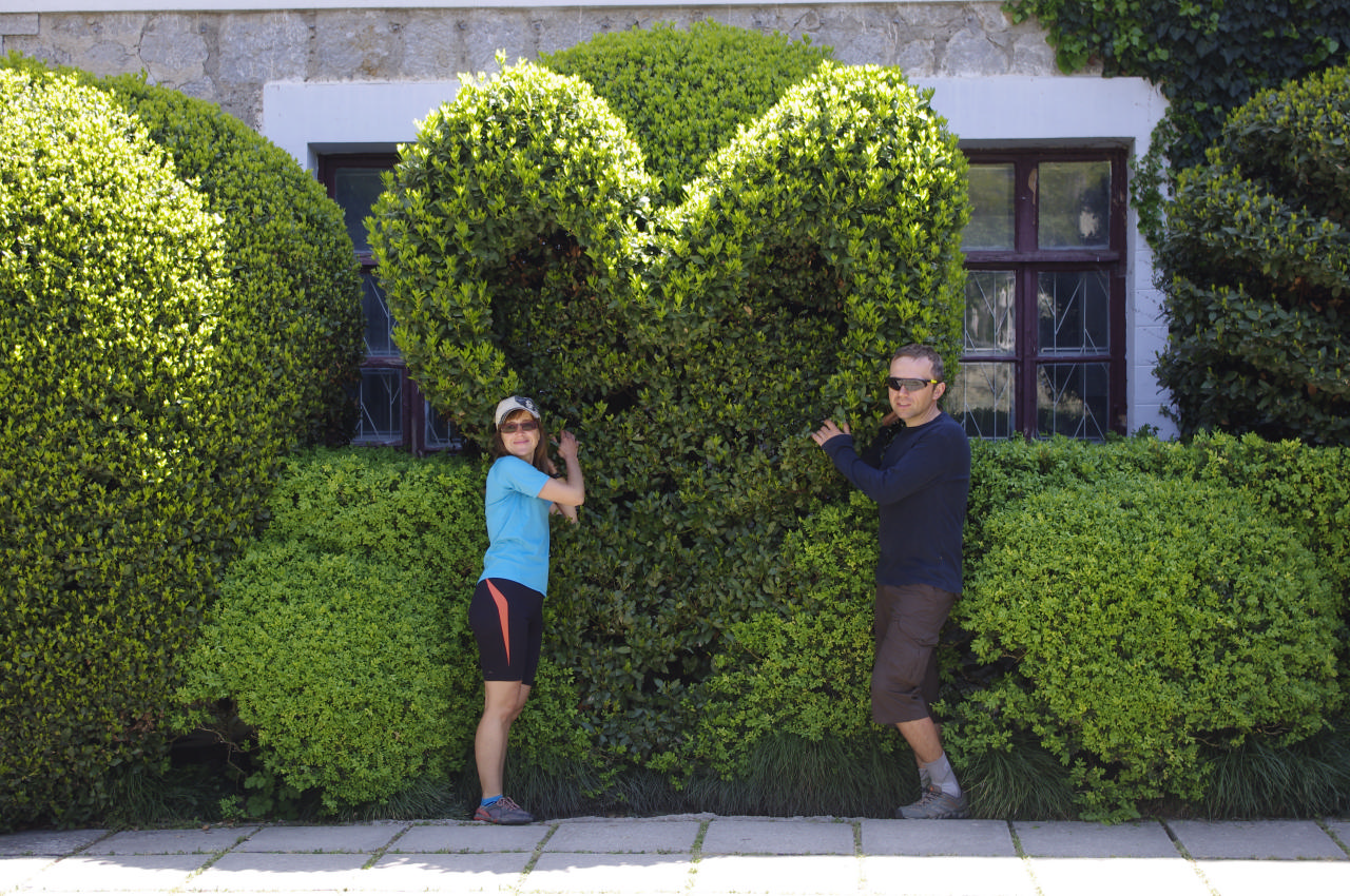 Следующим местом остановки стал Никитинский ботанический сад. Спускались мы к нему в предвкушении отличной прогулки. Но тут на нашем пути возник какой-то паренек, пытавшийся нас убедить в том, что дальше ехать на велах нельзя и надо поставить их тут. Он любезно указал нам место для парковки, пообещал присмотреть за великами. После того, как все мы упрессовались на выделенном нам пяточке, мы направились ко входу в сад. И что бы вы думали произошло дальше? Парень сообщил нам, что мы должны ему по 10 грн за парковку 1 велосипеда! А сам вход в сад стоит еще по 30 грн с человека. Такого поворота событий мы не ожидали. На нашу просьбу предоставить документы, подтверждающие, что мы находимся на территории ботанического сада и должны платить за парковку, парень связался с кем-то по рации, попросил принести документы, после чего ушел парковать машины в сторону от нас. Мы же взяли велосипеды, подъехали спокойно ко входу в сад, поставили их возле лавочки и оставили меня, Сережу, Игоря и Олега сторожить их. Мы согласились сделать это бесплатно. Парни пошли есть мороженое на сэкономленные деньги, а Олег еще и посмотрел на планшете экскурсию по Никитинскому саду.