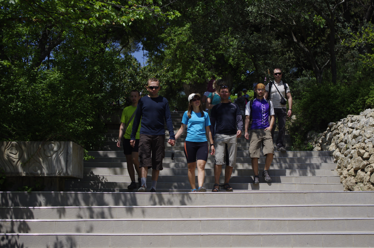 Выехали в Ялту. Проехали Гурзуф, затем встретили по пути надпись «Артек», после чего решили свернуть к нему. Нас пропустили на проходной, мы немного спустились по территории лагеря и увидели легендарные Адалары! Естественно, все кинулись позировать на их фоне, пытаясь уместиться на краю ограждающей конструкции. Внизу, у моря, на вдающихся в него волнорезах занимались йоги – красивое зрелище. Как позже мы выяснили из чьего-то путеводителя, в этом районе, наравне с йогами, водится большое количество птиц… И снова в путь.