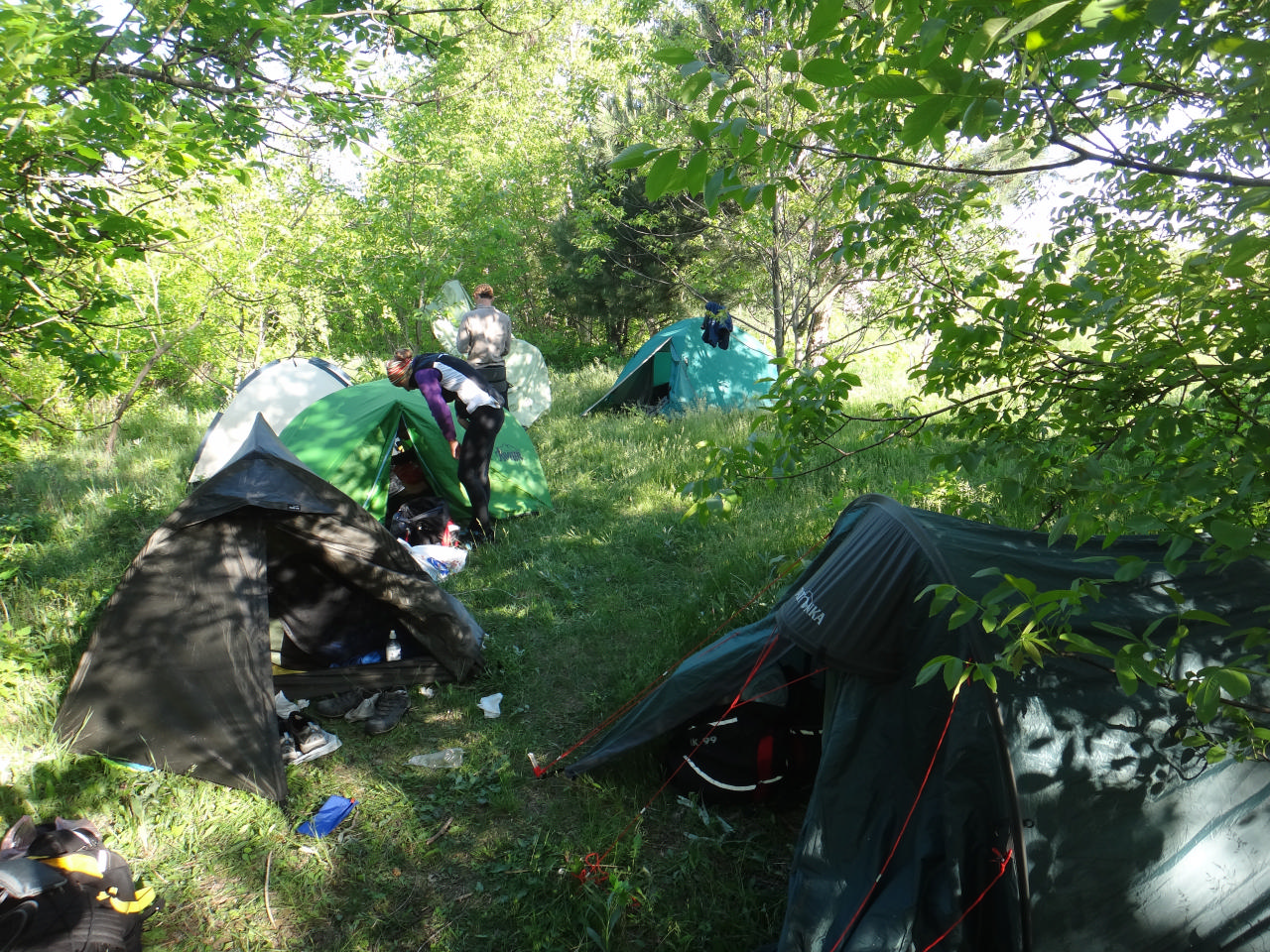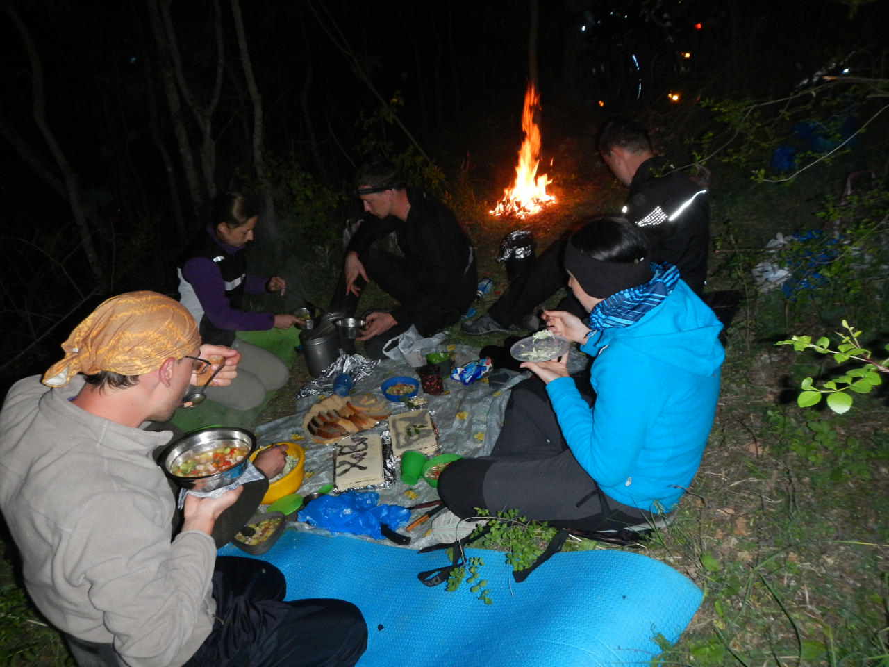 Игорь с Олегом готовили ужин, они ведь молодцы. Лариса же смастерила торт! Да-да, торт! Сметанно-желейный, с бананами и печеньками - красота! Мы потихоньку ставили палатки, причем на этой территории уместились все 5, так что мы чувствовали себя комфортно и защищенно. Наступила ночь – все разошлись по своим берлогам…