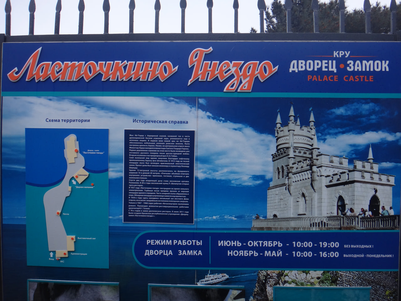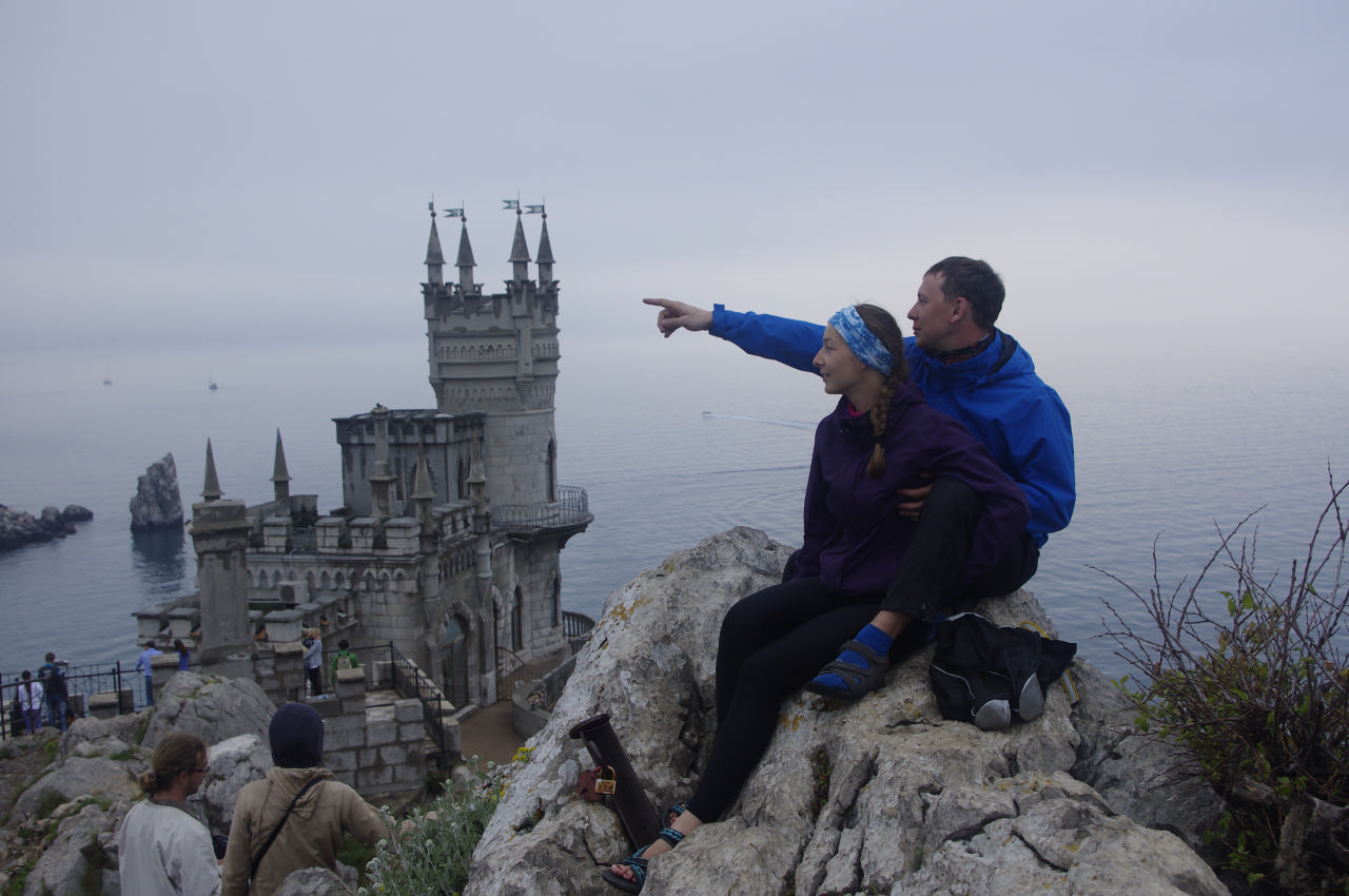 Дождь утих, мы поехали дальше. Ласточкино гнездо пошли посмотреть те, кто там еще не был. Шурик с Ларисой остались с велами. Какой бы хмурой ни была погода, нам она не помешала. Мы вдоволь нафоткались, заглянули вовнутрь, поели блинчики, узнали, что теперь вместо кафе в Ласточкином гнезде проходит выставка Сальвадора Дали. А рассказала нам об этом очень симпатичная девушка ) Пока ждали блины, узнали, что, к сожалению, тут со скалы периодически падают люди, скалолазы… А еще Ласточкино гнездо – одно из мест, которые надо посетить в 2013 году по версии журнала National Geographic, если я не ошибаюсь.