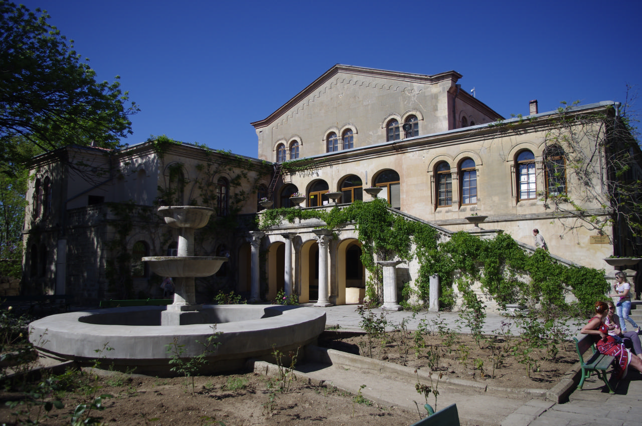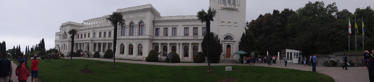 Контрастом Массандровскому дворцу послужил Ливадийский дворец. Он впечатлял своими размерами, запутанными тропинками, количеством пристроек, беседок… Лично мне он показался менее уютным. Стоял он на виду, грудью встречая гостей, тогда как для того, чтобы подобраться к Массандровскому дворцу, нам потребовалось подняться на горку и пересечь территорию за оградой.