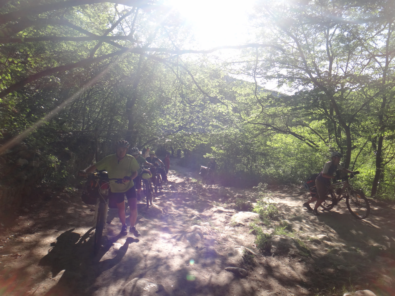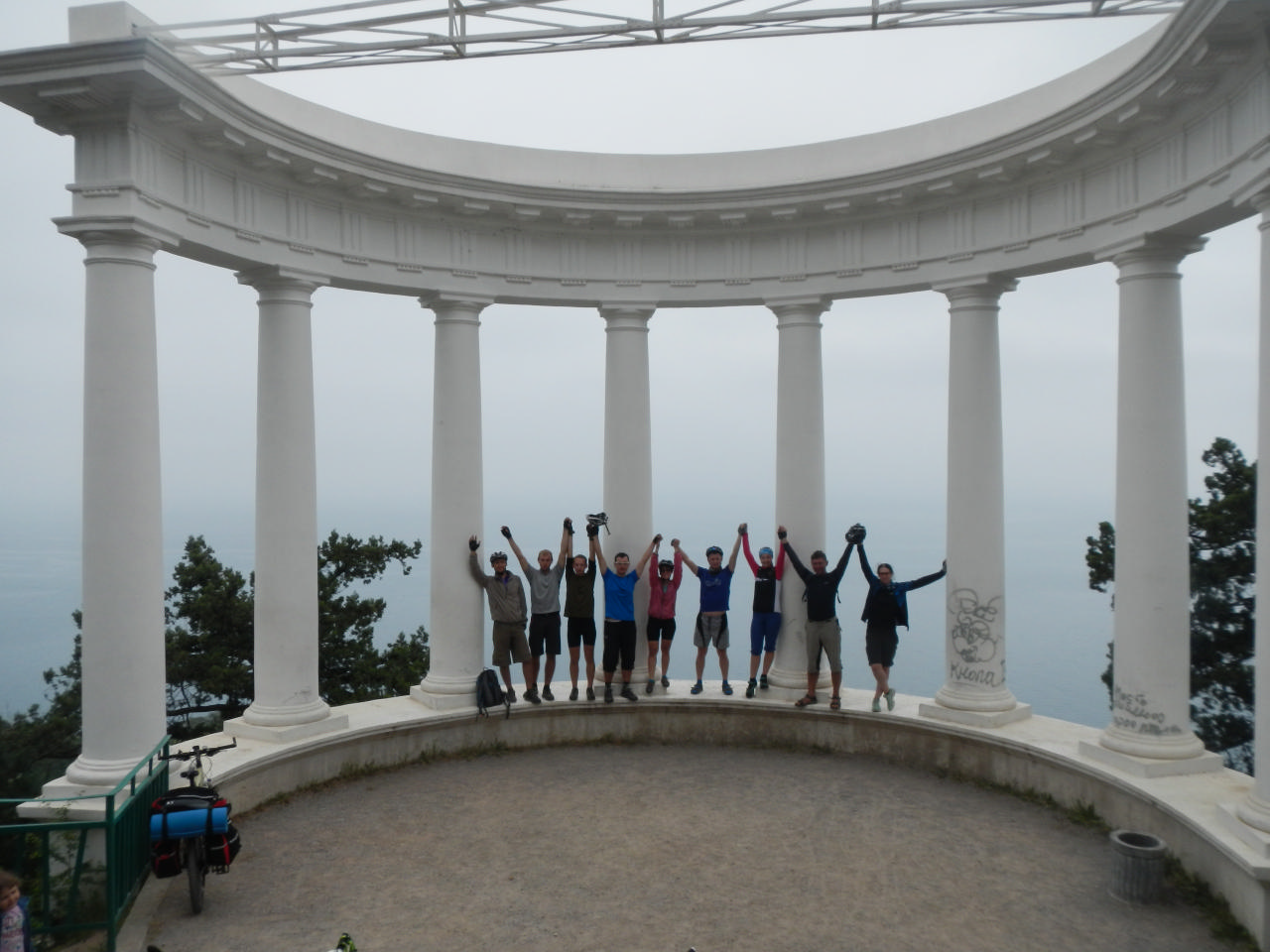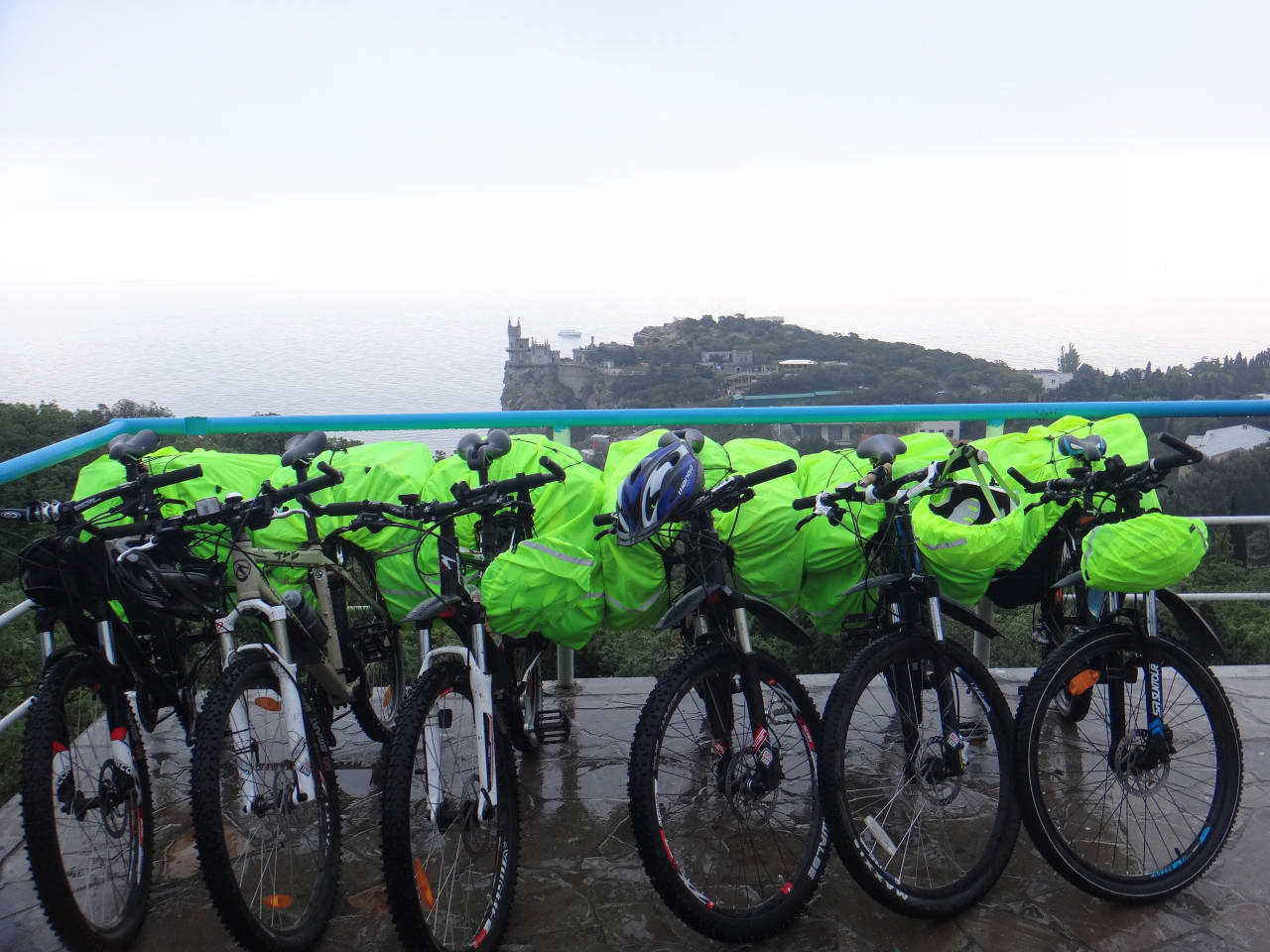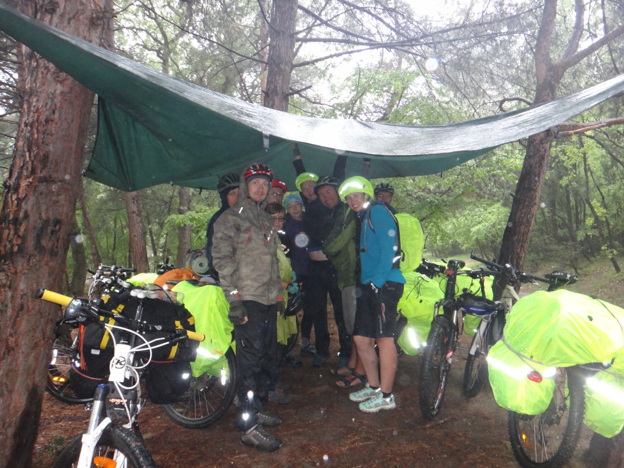 От дворца к Ласточкиному гнезду мы поехали по Солнечной тропе. Лариса пообещала, что это совсем матрасный путь, но нам то и дело приходилось спешиваться и тащить велы. В результате, конечно, все захотели кушать и мы остановились прямо возле тропы пообедать. Только мы закончили свою трапезу, в которую, кстати, входили уже и куличики, как начал накрапывать дождь. Мы переоделись, надели чехлы на все, что можно, и поехали. Решили переждать дождь и тут нас во второй раз выручил тент. Натянули мы его, спрятались вместе с велами и молодой парой с малышом, которых мы приютили, чтобы те не мокли. Коротали время Контактом. Понимание наше и единение достигло того уровня, когда мы стали понимать друг друга с полуслова. Особенно запомнилось Ларисино «такие же как руки, только снизу» (ноги) и, Шурика «зашел в магазин, купил что-то, потом вышел, посмотрел на покупку… (затем была его раздосадованная гримаса)» Знаете, что это за слово? «Перепутал» ))