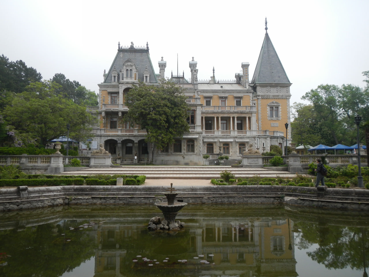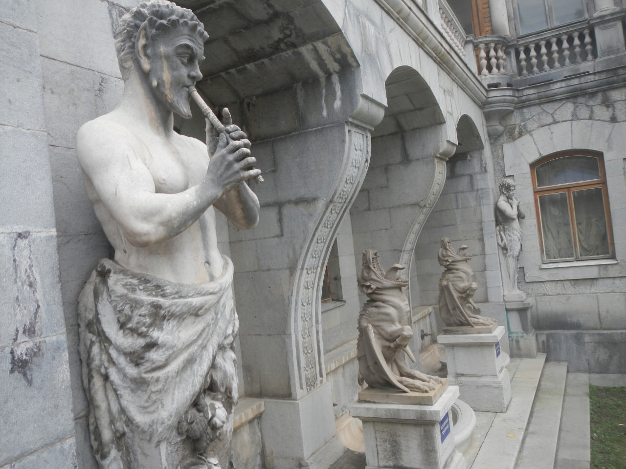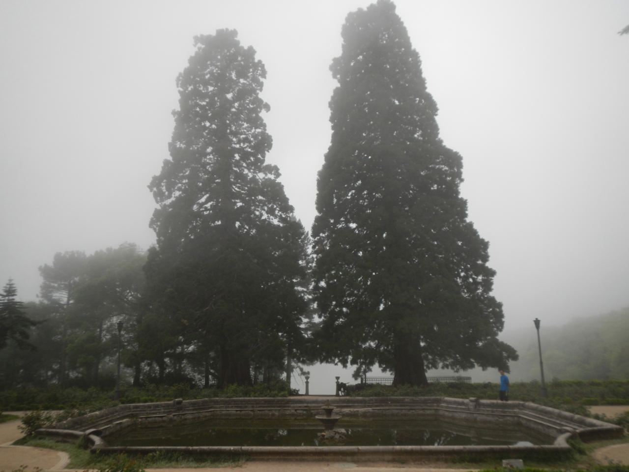 И поехали мы в Массандру… Утро было прохладным, Массандровский дворец предстал перед нами таинственным силуэтом, окутанным туманом. Едва мы успели обойти его и пофотографировать, как завеса тумана опустилась и спрятала его от взгляда посетителей. Дворец, не смотря на то, что он небольшой, отличается красивой архитектурой, изящными узорами на фасадах и интересными статуями во дворе. Как двое стражников, караулят дворец 2 стройные секвойи, причем караулят 130 лет! Это обстоятельство так нас удивило, что мы набрали шишек с целью посадить их дома – интересно посмотреть на результат. Позади дворца и прогулочных тропинок раскинулась сочная зелень. Было бы в нашем распоряжении побольше времени, интересно было бы пройтись по ней и посмотреть, куда она простирается.