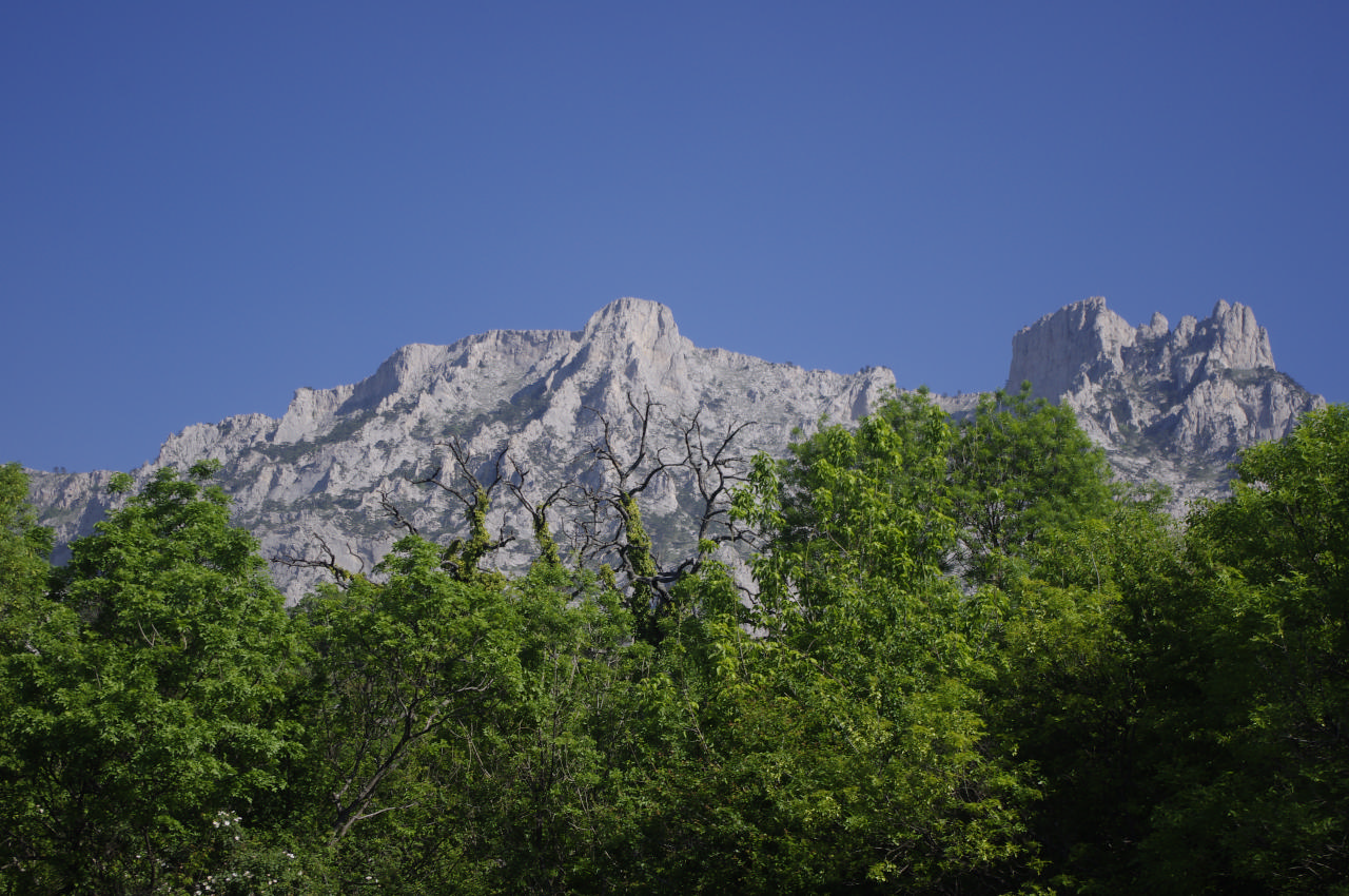 [spoiler]Утро было влажным, росы много. Но туман рассеялся. Ранее мы решили не подниматься на Ай-Петри из-за плохой видимости, а сегодня мы смогли увидеть его величие прямо с места нашей стоянки! Вид был отличный: вершина словно разрывала зеленую мантию лесочка, в котором мы остановились.
