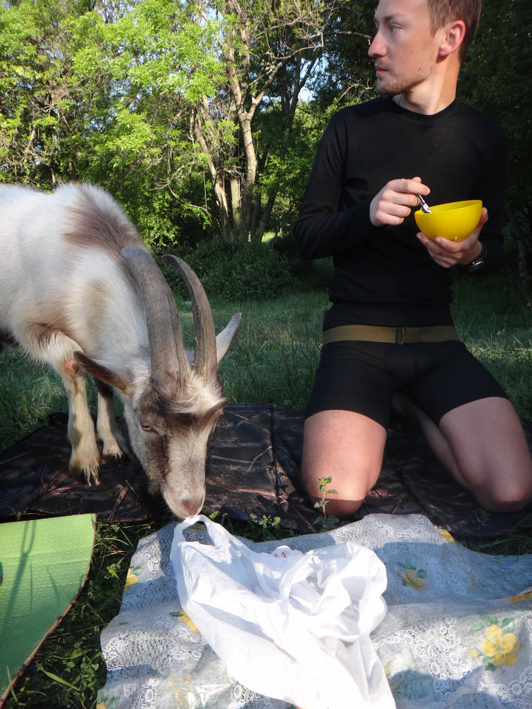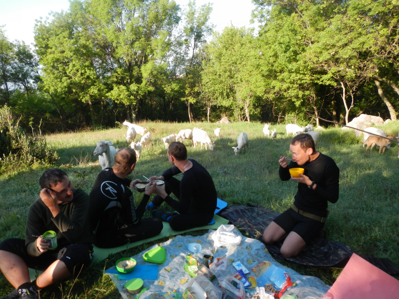 Завтраком нас порадовали Андрей с Шуриком, но вот нам пришлось делить еду не на десятерых – к завтраку подоспел козел из стада, пасшегося неподалеку от нас. Людей он явно не боялся и чувствовал себя уверенно, держался с достоинством, когда проходился мордой, как пылесосом, по пенкам вокруг стола.