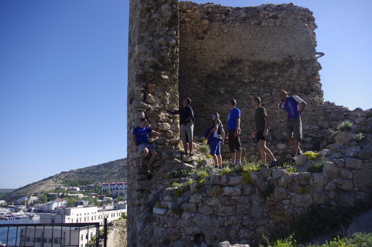 Во-первых, крепость в Балаклаве – небольшая, но интересная. Интересная тем, что расположилась многоярусно, причем на сааамом краю – до моря рукой подать. Ну и нигде мы еще не встречали таких заманчивых сооружений для лазания по ним. На подпорки, воздвигнутые уже нашими современниками, вскарабкались очень проворно… И было ради чего... А вот и во-вторых!