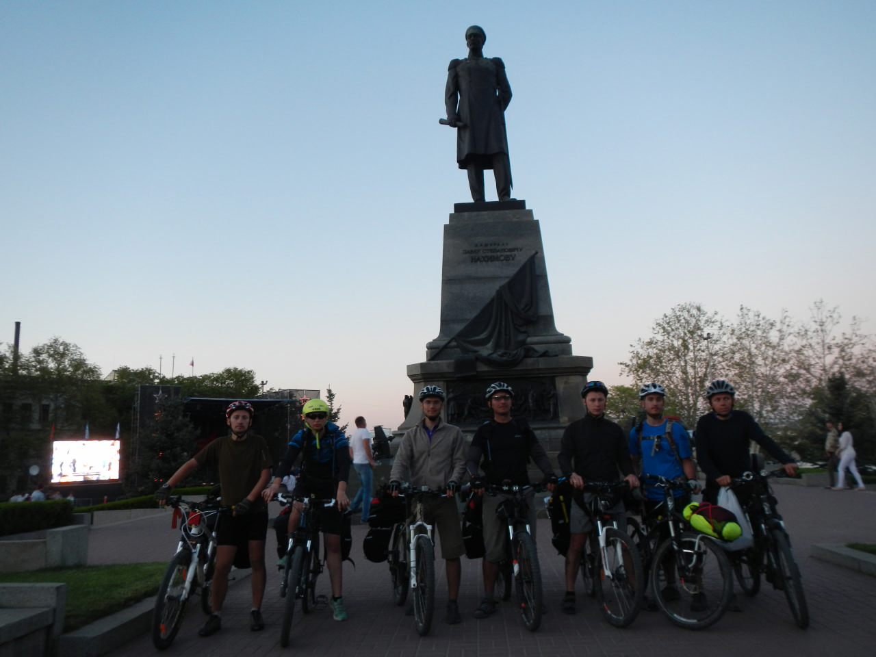 Дело шло к вечеру, но нам предстояло посмотреть еще набережную. И мы-таки успели сделать это засветло! Увидели и памятник затонувшим кораблям, и Нахимову… Но в предзакатный час было поздно искать место ночевки, поэтому мы просто расположились в гор. Парке. Местечко было подобрано более-менее закрытое от чужих глаз, мы общались негромко, фонариками старались не мельтешить в разные стороны – в итоге все прошло гладко и нас не покатали в украинских уазиках.