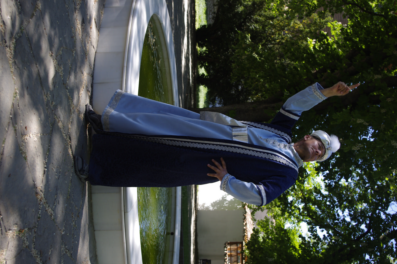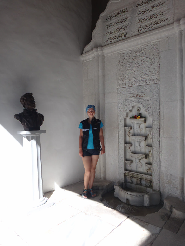 Бахчисарай встретил нас шумными узкими улочками, мальчиками-зазывалами в кафе прям возле входа в дворец. Местный колорит очень хорошо ощущался здесь. Мы поддались ему и наш начальник не смог не примерить халат султана. Фотосессия с батыром вышла чудесная – Андрей легко вошел в образ, а мы пытались подыграть ему, как могли. Сам дворец был очень изящной работы – все выглядело очень дорого, искусно и по-восточному тонко. Поделиться впечатлениями я позвонила папе, после чего он поставил мне задачу: сфотографироваться возле знаменитого Фонтана Слез. Подвести папу я не могла, поэтому пошла к кассам узнавать, где он находится. Выяснилось, что он во внутреннем дворике, куда вход, разумеется, платный. Нами был разработан хитрый план: приобрести билет по студенческому Оли и сделать фото за 30 гривен, а не за 60. План состоялся, фото сделано. Только вот разочарованию моему не было предела – этот знаменитый фонтан был совсем небольшим сооруженьицем, да и воды-то в нем было немного… А почему он так знаменит – это вам домашнее задание: найти информацию и почитать )