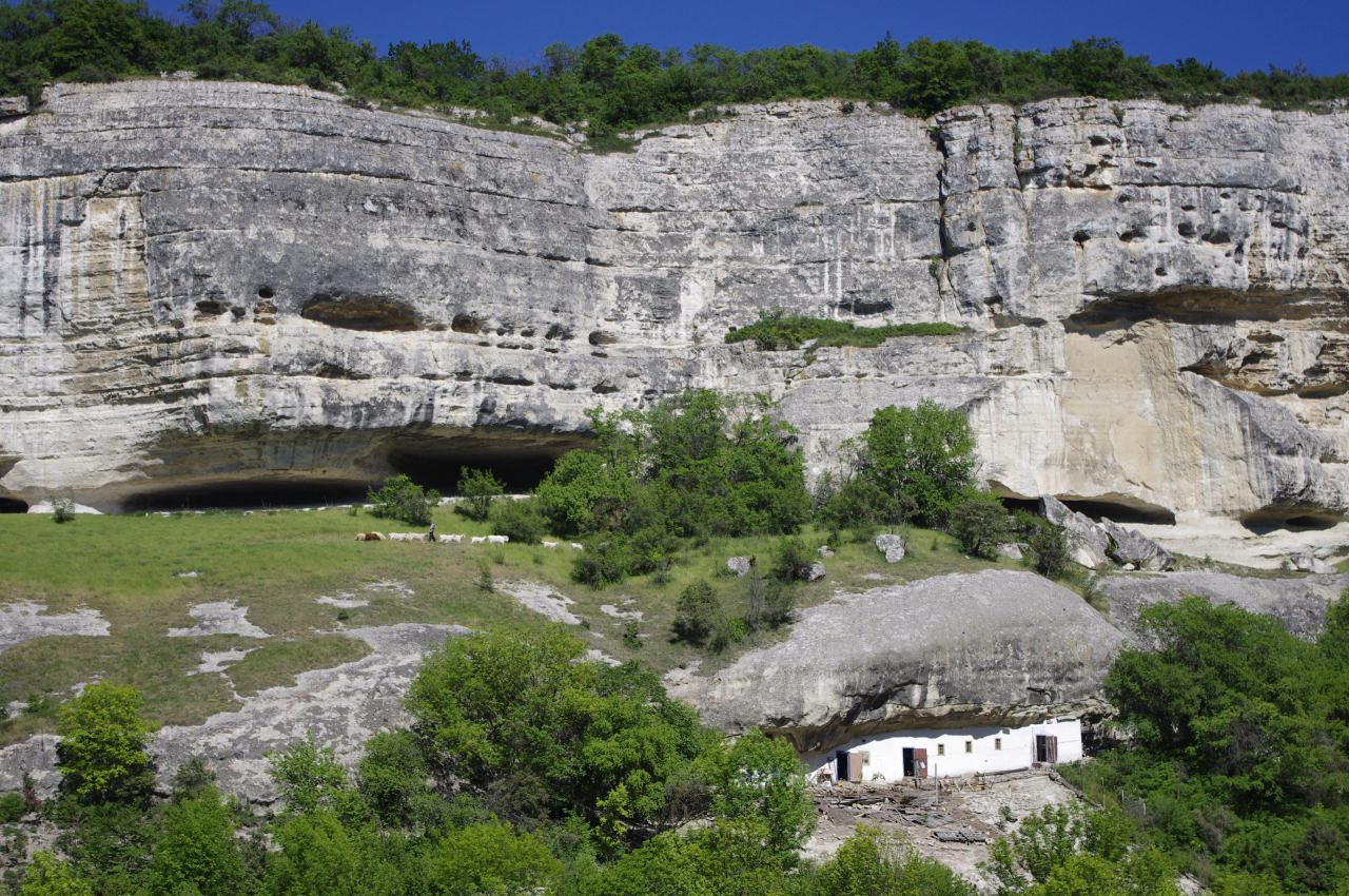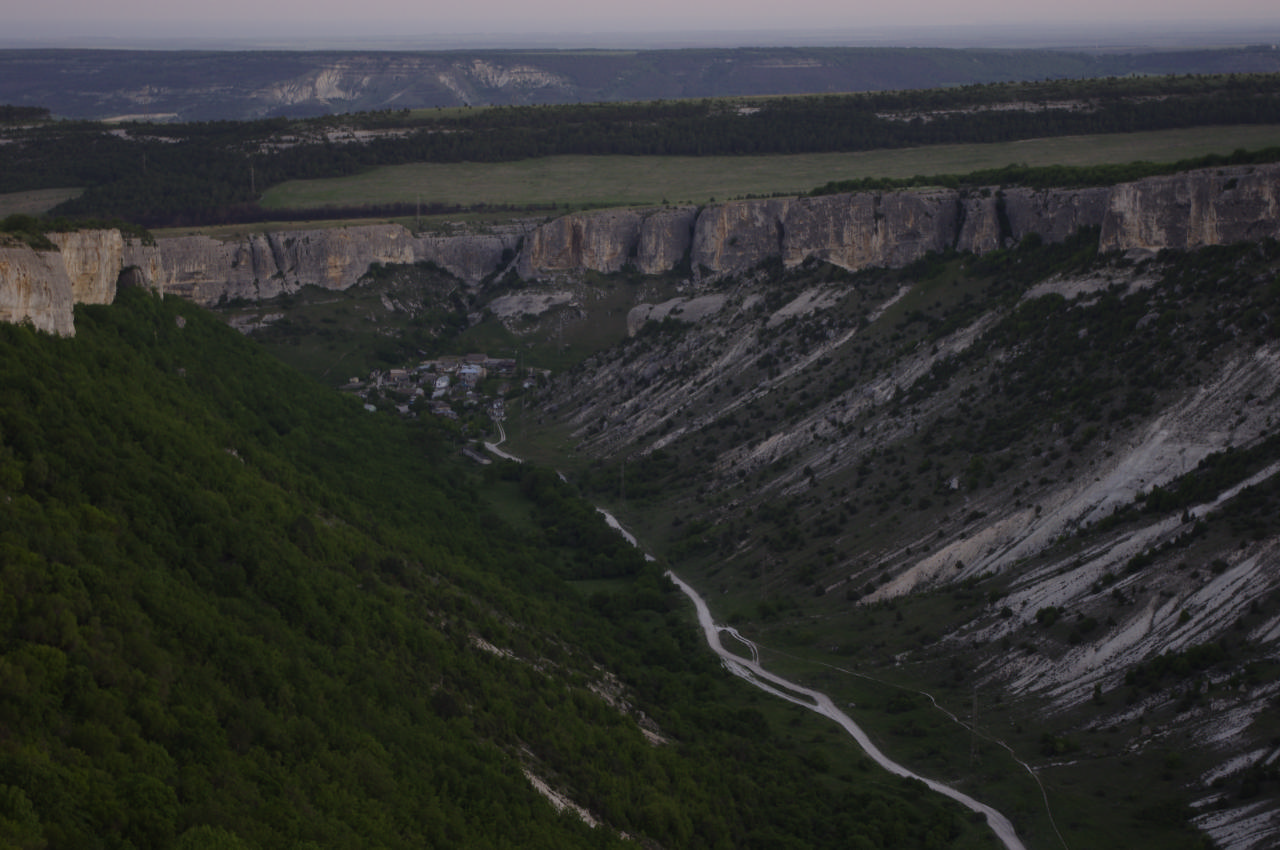 Подкрепившись, мы направились к пещерным городам. Пока мы ехали/толкали по запыленным узким туристическими дорожкам, время не стояло на месте. И когда мы подъехали к стенам одного из городов, то поняли, что до закрытия для туристов осталось совсем немного времени и нам там делать уже нечего. В таком случае, мы решили искать место для ночевки и смотреть Чуфут-Кале утром.