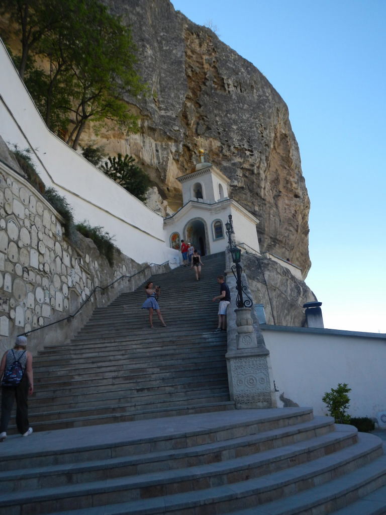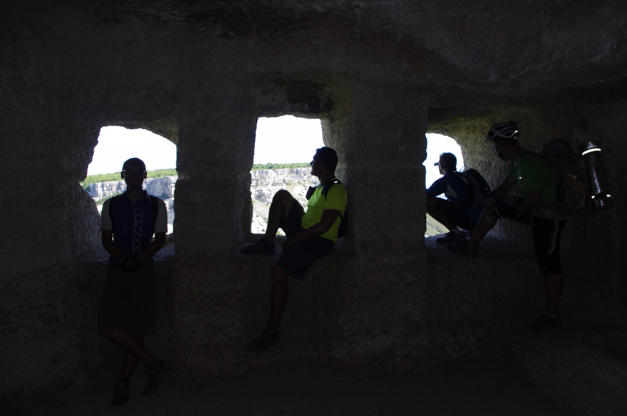 Следующей нашей остановкой была церковь в скалах по пути к пещерным городам. Красивая церковь, к ней поднимались ступени, будто на небо. И прямо возле скалы – иконы. Их нельзя было фотографировать, как выяснилось. И проезжать на велах было нельзя мимо церкви – охранники ругали за это. Больший интерес вызвало данное место у Ларисы. Рядом был небольшой ларек, в котором продавались сборы трав монастырские, мед и все, что полагается продавать в подобных местах. А еще рядом был родник со святой водой. Мы набрали ее в имеющуюся у нас тару, смыли с лиц своих усталость, утолили жажду… Дольше всех вокруг церкви блукал Олег. Несмотря на красоту церкви, верх над нами взяло чувство голода и мы, немного отъехав, расположились на поздний обед – дело было около 16:00.